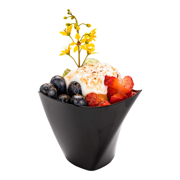 Serve delectable single-portion treats with our Mini Serve 4-ounce Black Plastic Mini Crescendo Cups with Silver Plastic Mini Forks. These dessert cups and tasting forks are crafted from robust, high-quality plastic and are disposable to provide an easy cleaning experience after meals. The sleek twisted shape and black finish of these parfait cups creates an upscale backdrop to showcase your colorful culinary creations while the shiny silver finish of these cake forks lends an elegant touch. With a capacity of 4 ounces, these black cups are perfectly sized for doling out samples of crème brûlée, miniature fruit tarts, or artisanal sorbets. Featuring sturdy handles and prongs, these plastic forks are ideal for spearing bites of cheese, slicing into petit fours, or scooping up crumbs of decadent chocolate cake. These decorative cups measure 3 inches long by 3 inches wide by 2.75 inches tall and have a capacity of 4 ounces, while the included dessert forks measure 4 inches long. Each order includes 100 cups and 100 forks.