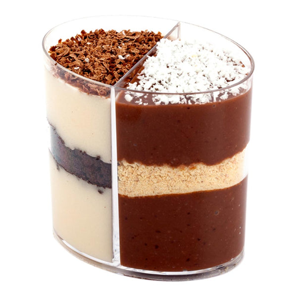 Host a modern event with our Bundle: Mini Serve 100 4-ounce Oval Clear Plastic Duet Tasting Cups with 100 Silver Plastic 4-inch Mini Spoons. This bundle includes 4-ounce oval clear plastic duet tasting cups and silver plastic mini spoons. These tasting cups ensure a smooth dining experience with their sleek rim design. These confection cups feature an oval shape with two compartments, allowing you to serve different desserts or appetizers simultaneously, while their clear design showcases the vibrant colors of your culinary creations. With a 4-ounce capacity and two compartments, these disposable party cups are perfect for pairing appetizers, desserts, or drinks. These silver plastic mini spoons measure 4 inches in length and effortlessly enhance the presentation of your tantalizing dishes with their shiny silver finish. Plus, these sturdy spoons can handle hefty bites, making them ideal for serving polenta, gelato, or miniature tuna tartare. Measuring 2.5 inches in length by 1.75 inches in width by 2.5 inches in height, these plastic duet tasting cups are ideal for your appetizer presentation. These spoons are 4 inches long to scoop the perfect bites. Each order includes 100 tasting cups and 100 mini spoons.