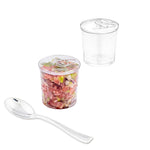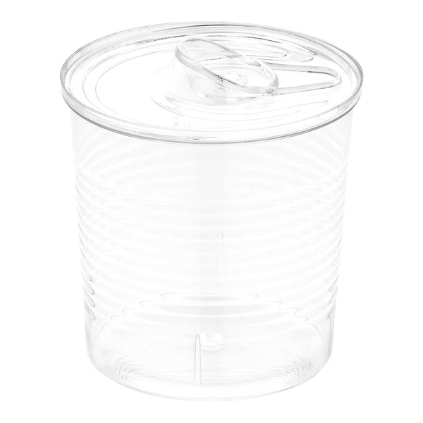 Elevate your appetizer presentations with our Bundle: Mini Serve 100 4-ounce Round Clear Plastic Tin Cans with 100 Silver Plastic 4-inch Mini Spoons. This bundle includes round clear plastic tin cans with removable lids and 4-inch silver plastic mini spoons. Crafted from premium plastic, these apperizer cups and spoons ensure they do not crack or warp during use. These plastic dishes boast a ridged design that mimics traditional tin cans, adding an authentic touch to your plated foods. The clear finish of these dessert dishes beautifully showcases your culinary creations. The lid of these serving dishes keep your dishes intact, preventing spills for a neat presentation. These plastic spoons feature a shiny finish, effortlessly enhancing the appeal of miniature tuna tartares, personal-sized strawberry shortcakes. With sturdy handles, these 4-inch spoons can withstand hefty bites of polenta and scoops of gelato. These disposable serving dishes and spoons can be discarded after use, providing an easy cleanup. Measuring 2.5 inches in diameter by 2.75 inches tall, these tin cans can hold up to 4 ounces of food. Each order includes 100 tin cans and 100 spoons.