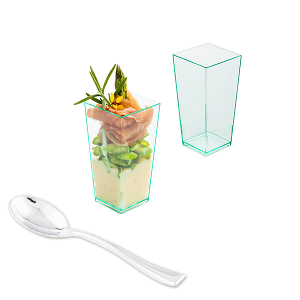 Elevate your appetizer presentation with our Bundle: Mini Serve 100 4-ounce Square Seagreen Plastic Tall Geometric Cups with 100 Silver Plastic 4-inch Mini Spoons. This bundle includes cups and spoons for a comprehensive dining experience. With a square design, these plastic cups showcase your meticulously crafted cocktails or layered desserts from all angles. the tall, tapered shape of these dessert cups serves as an ideal vessel for mixed drinks or desserts at events. These disposable cups feature a crystal clear seagreen finish that enhances the visual appeal of colorful cocktails, enabling swift and easy cleanup. Complementing the cups are these plastic spoons, featuring a shiny silver finish designed to effortlessly enhance the presentation of your tantalizing dishes. These 4-inch spoons have a sturdy handle and are the perfect enjoying hefty bites of polenta, and big scoops of gelato. Made from premium plastic, these disposable cups and spoons are durable and do not crack or warp easily. These plastic cups and spoons are disposable and can be discarded after use. Measuring 1.5 inches in length by 1.5 inches in width by 3.25 inches in height, these parfait cups can hold up to 4 ounces. Each order includes 100 cups and 100 spoons.