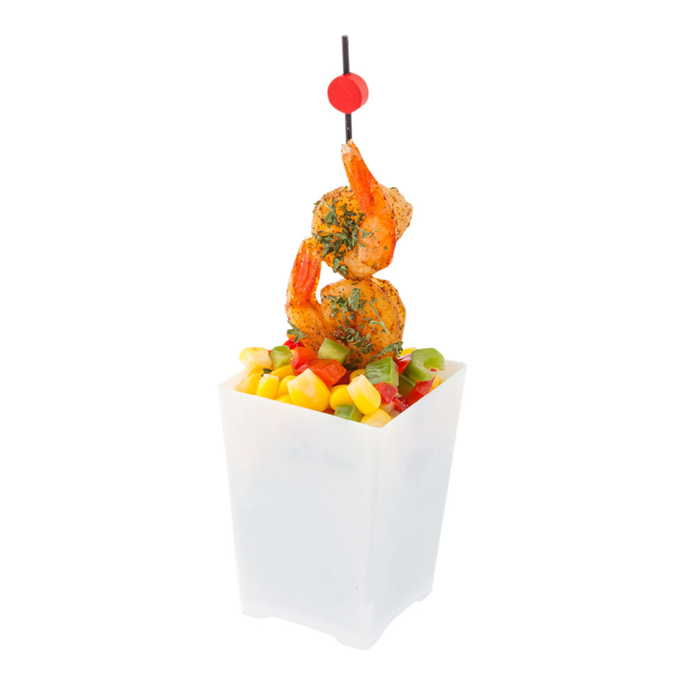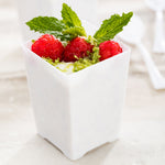 Elevate your event with our Bundle: Mini Serve 100 4-ounce Square White Plastic Tall Quadrato Cups with 100 Silver Plastic 4-inch Mini Spoons. This bundle includes our plastic quadrato cups and silver plastic mini spoons, providing durability and style. These appetizer cups are made from premium plastic, ensuring durability to cracking and warping for reliable use. The square shape of these plastic cups creates a modern look, adding a sleek and stylish element to any appetizer presentation. These disposable cups have a white finish that offers a clean and minimalist aesthetic. The silver plastic finish of these 4-inch spoons effortlessly enhances the presentation of your tantalizing dishes, from miniature tuna tartare to personal-sized strawberry shortcakes. With sturdy handles, these disposable spoons can handle hefty bites and big scoops, making them ideal for polenta and gelato. These dessert cups and plastic spoons are disposable and can be discarded after use, facilitating an easy cleanup. Measuring 2 inches in length by 2.75 inches in width by 2 inches in height, these plastic cups can hold up to 4 ounces. Each order includes 100 cups and 100 spoons.
