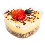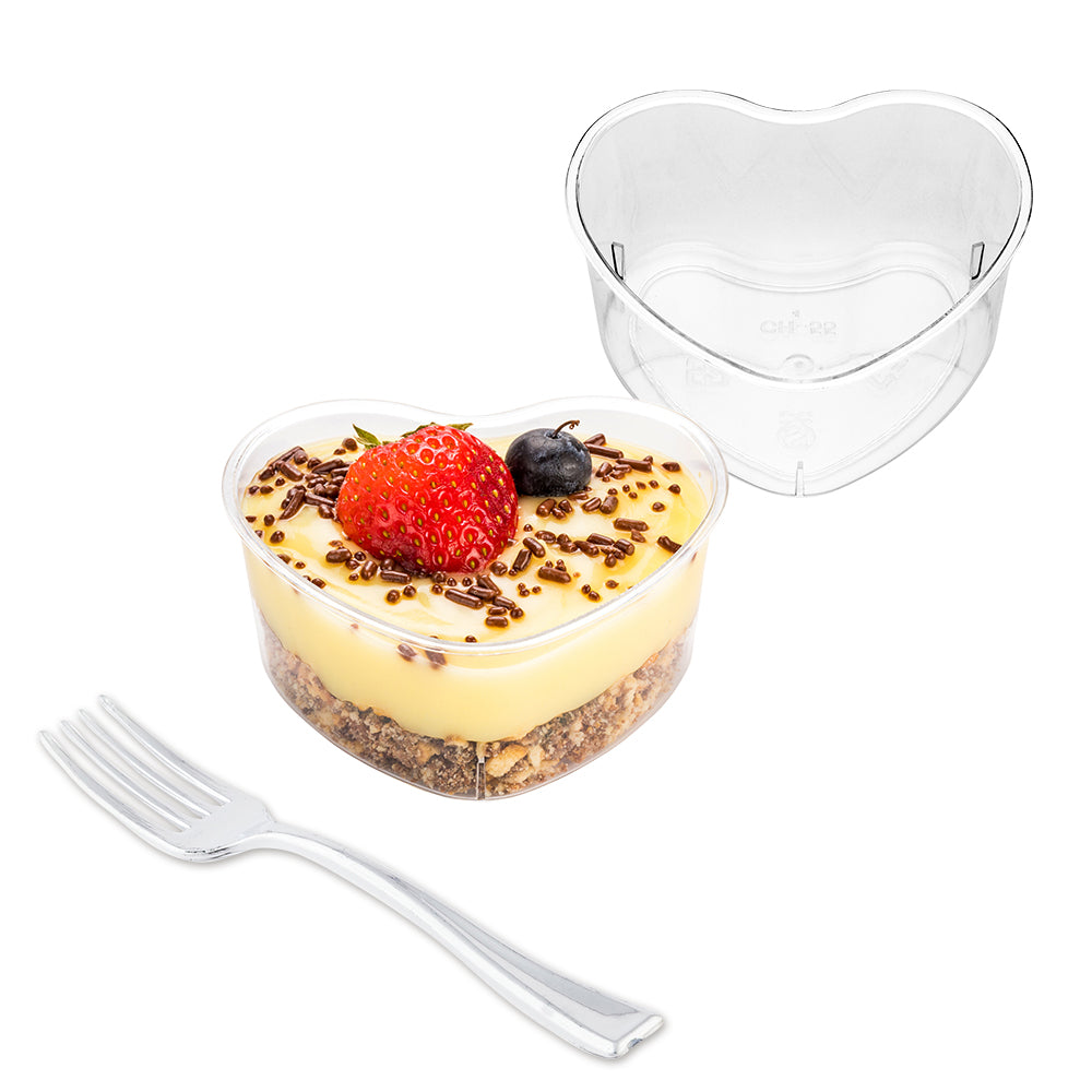 Create an unforgettable dessert experience with our Mini Serve 5-ounce Clear Plastic Mini Heart Cups with Silver Plastic Mini Forks. Crafted from high-quality PS plastic, these heart cups and cake forks are disposable for an easy cleanup after meals. Designed in a cute heart shape, these clear plastic cups have a capacity of 5 ounces, allowing you to craft miniature works of art that will delight guests at any special occasion. With raised edges, these pudding cups securely contain even the messiest of sauces while perfectly showcasing each delectable treat within. The included disposable forks have a shiny silver finish with sturdy handles, making enjoying every bite a breeze. These dessert cups measure 3.25 inches long by 3 inches wide by 1.5 inches tall and have a capacity of 5 ounces, while the plastic forks measure 4 inches long. Each order includes 100 cups and 100 forks.
