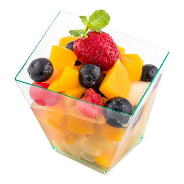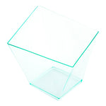Elevate your culinary presentations with our Bundle: Mini Serve 100 6-ounce Square Seagreen Plastic Large Girata Dishes with 100 Silver Plastic 4-inch Mini Spoons. This bundle includes plastic dishes and plastic mini spoons, providing a cohesive and stylish tableware set.Crafted from premium plastic, these dessert cups and spoons are durable, ensuring they do not crack or warp easily. The geometric-inspired design of these plastic cups immediately enhances your dish's presentation. These appetizer cups have a seagreen finish and add a pop of color to your tablescapes. With a shiny silver finish, these plastic spoons effortlessly enhance the tantalizing dishes. These 4-inch spoons are the ideal size to accompany miniature tuna tartare or personal-sized strawberry shortcakes. With strong and sturdy handles, these mini spoons can stand up to hefty bites of polenta and big scoops of gelato. These seagreen dishes measure 3.25 inches long by 2.75 inches wide by 3 inches high and can hold up to 6 ounces of food. Each order includes 100 plastic dishes and 100 spoons.