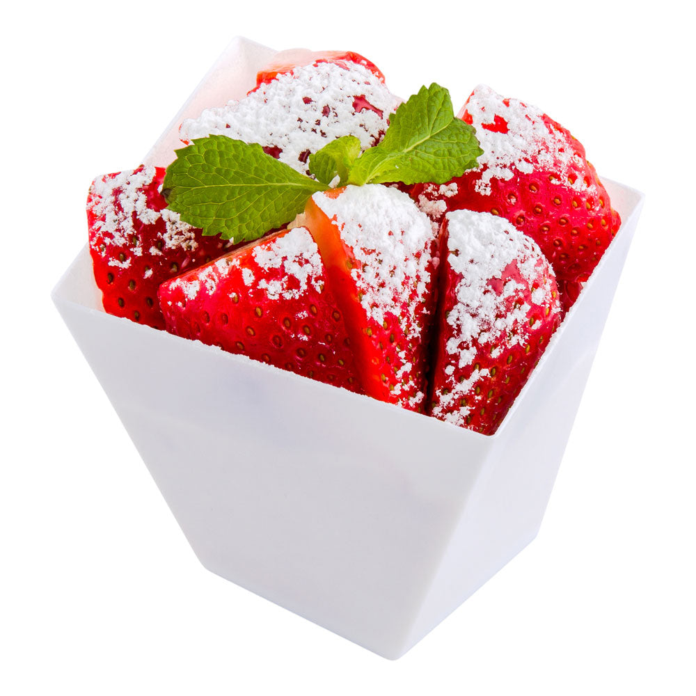 Elevate your appetizer presentation with our Bundle: Mini Serve 100 6-ounce Square White Plastic Large Girata Dishes with 100 Silver Plastic 4-inch Mini Spoons. This bundle includes chic square white plastic dishes and shiny silver plastic mini spoons. Crafted from premium plastic, these dessert cups and spoons are durable, ensuring they do not crack or warp during use. The geometric design of these plastic cups boast sharp corners and clean lines that instantly upgrade the visual appeal of your cuisine. With a white finish, these appetizer cups adds sophistication to your food presentation. The shiny silver finish of these 4-inch spoons effortlessly enhances the presentation of your tantalizing dishes. These plastic spoons feature strong and sturdy handles that can withstand hefty bites. Designed for convenience, these disposable cups and spoons can be discarded after use for an easy cleanup. These plastic dishes measures 3.25 inches in length by 2.75 inches in width by 3 inches in height and can hold up to 6 ounces. Each order includes 100 plastic dishes and 100 spoons.