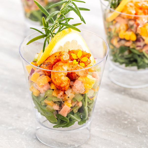 Elevate your culinary presentations with our Bundle: Mini Serve 100 7-ounce Round Clear Plastic Large Parfait Glasses with 100 Silver Plastic 4-inch Mini Spoons, offering a sophisticated and practical solution for showcasing delectable treats. This bundle includes parfait glasses and mini plastic spoons for a cohesive dining setup. Crafted from premium plastic, these appetizer cups and spoons are designed to be robust, ensuring they do not crack or warp easily. The clear finish of these plastic cups showcases layered desserts beautifully, injecting an element of sophistication into any celebration or dining experience. With a shiny silver finish, these plastic spoons effortlessly enhance the presentation of your tantalizing dishes, These 4-inch spoons have strong and sturdy handles that stand up to hefty bites of polenta and big scoops of gelato. Ideal for a quick cleaning experience, these disposable cups and spoons can be discarded after use. These dessert glasses measure 3 inches in diameter by 3.5 inches in height and can hold up to 7 ounces. Each order includes 100 glasses and 100 spoons.