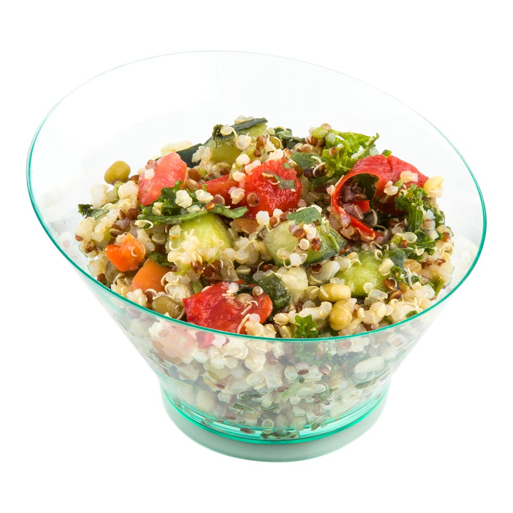 Elevate your culinary presentations with our Bundle: Mini Serve 100 7-ounce Round Seagreen Plastic Incline Bowls with 100 Silver Plastic 4-inch Mini Spoons. This bundle includes 100 seagreen plastic incline bowls and 100 silver plastic mini spoons. Made from premium plastic, these serving dishes and spoons are durable and do not warp or break easily, ideal for serving food at buffets or catering events. With a distinct sloping edge, these serving bowls lend a creative touch to your food displays. The translucent seagreen finish of these food bowls adds a refreshing pop of color to any table setting. With a shiny finish, these plastic spoons are designed to effortlessly enhance the presentation of your tantalizing dishes. The sturdy handles of these 4-inch spoons are built to stand up to hefty bites of polenta and big scoops of gelato. These plastic serving bowls and food spoons are disposable and can be discarded after use, facilitating an easy cleaning experience. Measuring 4.25 inches in diameter by 2.75 inches in height, these disposable bowls can hold up to 7 ounces. Each order includes 100 bowls and 100 spoons.