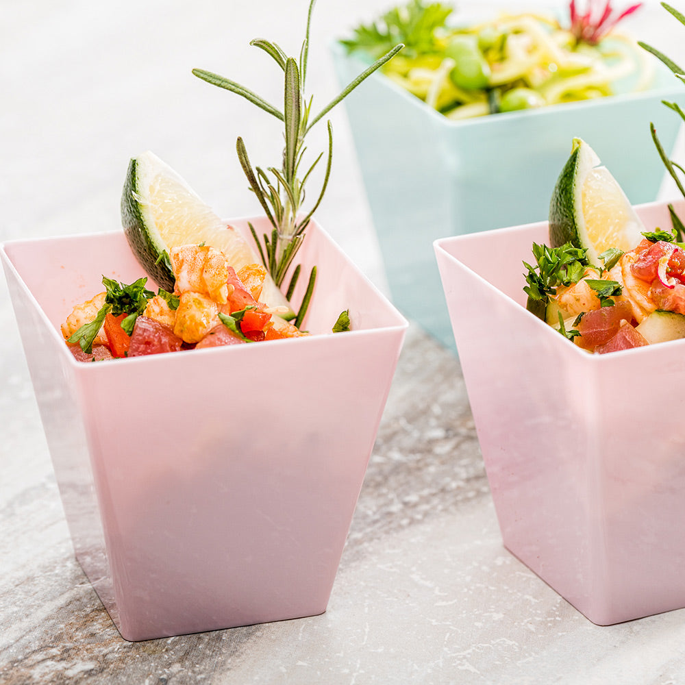 Elevate your dessert presentations with our Bundle: Mini Serve 100 8-ounce Square Powder Pink Plastic Large Kova Cups with 100 Silver Plastic 4-inch Mini Spoons. This bundle includes powder pink plastic dessert cups and mini spoons, providing you with all the necessary elements to serve your delectable creations. Crafted from premium plastic, these appetizer cups and spoons withstand breaking and cracking, ensuring reliable use. The geometric square shape of these plastic cups adds an appealing visual element to your dessert table or salad station. These dessert cups flaunt a powder pink finish with a tapered design, heightening the sophistication of your dessert displays. Plus, these plastic spoons feature a shiny finish, effortlessly enhancing the presentation of your tantalizing dishes. The strong and sturdy handles of these 4-inch spoons stand up to hefty bites and big scoops. Ideal for easy cleanup, these disposable cups and spoons can be discarded after use. Measuring 2.75 inches in length by 2.75 inches in width by 2.75 inches in height, these pink cups can hold up to 8 ounces. Each order includes 100 cups and 100 spoons.
