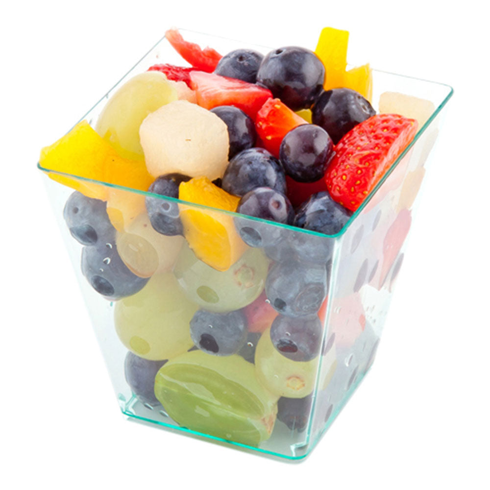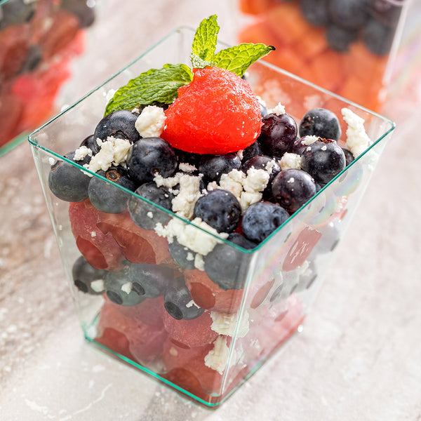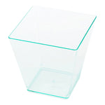 Impress your guests with a stylish tablescape using our Mini Serve 8-ounce Square Seagreen Plastic Large Kova Cups with Silver Plastic Mini Forks. These dessert cups feature a sleek tinted-seagreen finish and modern geometric design to elevate your dessert presentations while the included mini forks have a silver finish for a refined, elegant touch. Made from premium plastic, these seagreen dessert cups and tasting forks are disposable, providing a convenient serving solution for catered events and foodservice operations. Featuring sturdy handles and a polished silver finish, these cake forks are ideal for serving bites of gelato, polenta, or tuna tartare. Pair these disposable cups with lids (SKU: RWP0049C) to form a tight-fitting seal. These square cups measure 2.75 inches long by 2.75 inches wide by 2.75 inches tall and have a capacity of 8 ounces, while the included plastic forks measure 4 inches long. Each order includes 100 cups and 100 forks. Lids are available and sold separately.