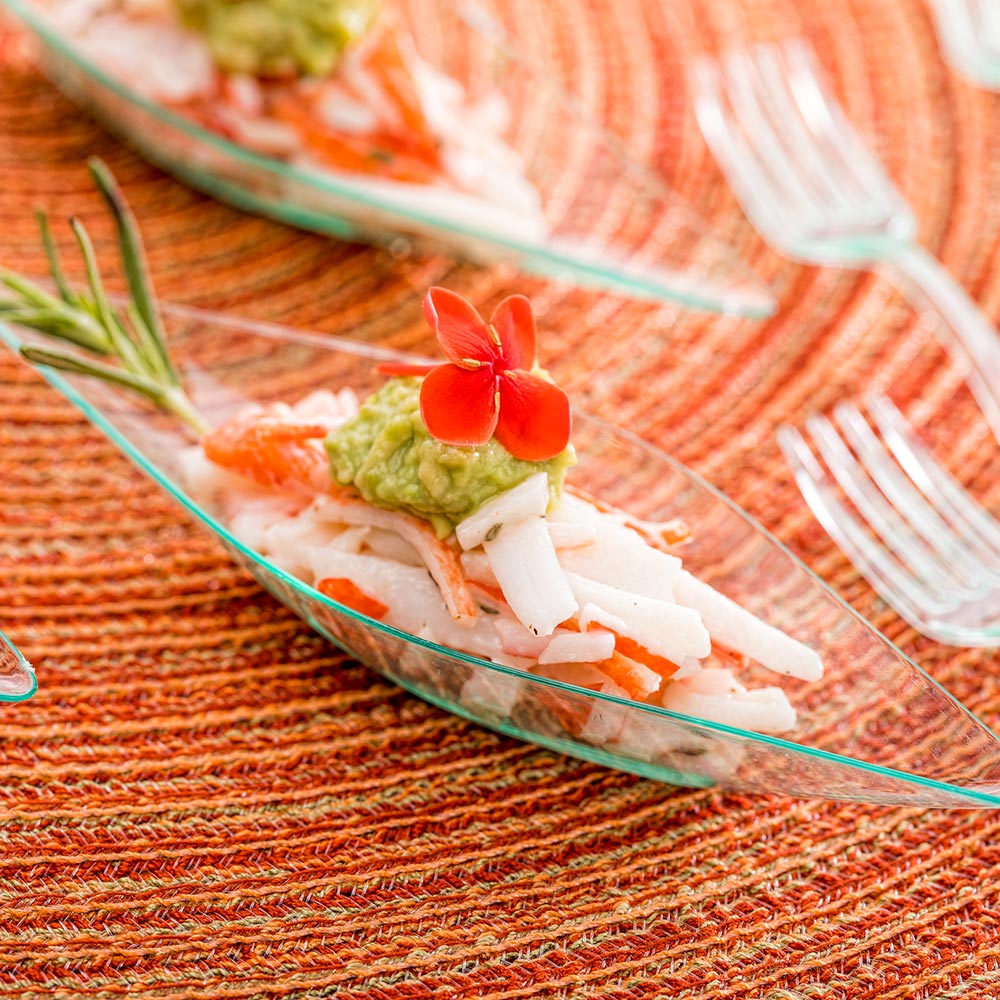 Serve appetizers with our Mini Serve Diamond Seagreen Plastic Canoe Dishes with Silver Plastic Mini Forks. Constructed from high-quality plastic, these canoe-shaped dishes are durable, sturdy, and dependable, allowing them to display a variety of cold food items securely. These plastic dishes are designed in a stylish canoe shape and have a modern tinted-seagreen finish, giving each appetizer a sophisticated touch. The elegant silver finish of these mini forks effortlessly enhances the look of various tablescapes. These 4-inch forks feature strong, sturdy handles built to withstand substantial bites without bending or breaking. For a simple post-meal cleaning experience, these dessert dishes and appetizer forks are disposable, making them ideal for large social gatherings. These serving trays measure 5 inches long by 1.5 inches wide by 0.75 inches tall, while the plastic forks measure 4 inches long. Each order Includes 100 dishes and 100 forks.