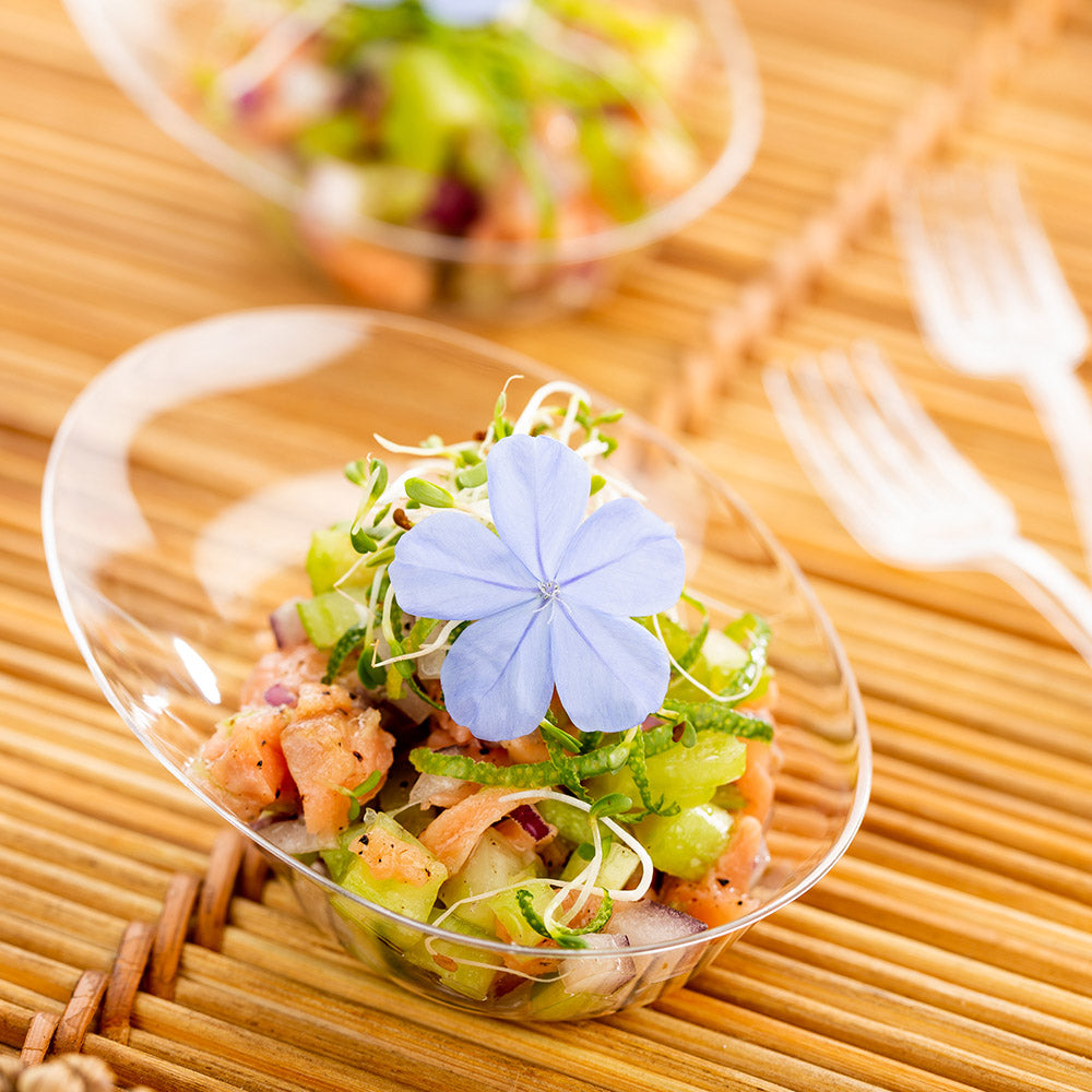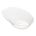 Give food and appetizer servings a chic cultivated flair with our Mini Serve Oval Clear Plastic Ellipse Dishes with Silver Plastic Mini Forks. Crafted from premium plastic, these serving dishes are durable and sturdy for serving a variety of cold food items. These clear plastic bowls feature a slightly askew oval shape that adds a charming touch to your fruits, flans, mini salads, and other bite-sized fares. The clear finish of these serving bowls enhances the beauty of amuse bouches, mini desserts, small appetizers, sauces, or other mini servings. Paired with the silver plastic forks, these clear bowls elevate the look of your table setting. These 4-inch forks have strong and sturdy handles and are built to stand up to hefty bites of polenta and big scoops of gelato. To offer a simple after-service cleaning process, these food bowls are disposable. These fruit bowls measure 4 inches in length by 3 inches in width by 1.25 inches in height, while the plastic forks measure 4 inches in length. Each order Includes 100 dishes and 100 forks.