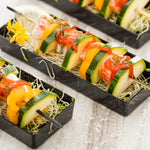 Elevate your culinary presentations with our Bundle: Mini Serve 100 Rectangle Black 5.2-inch Plastic Modern Plates with 100 Silver Plastic 4-inch Mini Spoons. This bundle includes 100 rectangular black plastic plates and 100 silver plastic mini spoons. Constructed from premium plastic, these modern plates provide strength and sturdiness. The raised edges of these plastic plates ensure secure food containment, while the elegant black finish and sleek rectangular shape enhance the aesthetic of your dishes. These silver plastic spoons feature a shiny finish, effortlessly enhancing the presentation of your tantalizing dishes, with sturdy handles that can stand up to hefty bites. These disposable 4-inch spoons are ideal for accompanying miniature tuna tartare, personal-sized strawberry shortcakes, polenta, and gelato. Measuring 5.25 inches in length by 1.75 inches in width, these spoons are 4 inches long. Each order includes 100 plastic plates and 100 mini spoons.