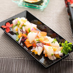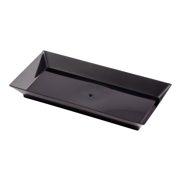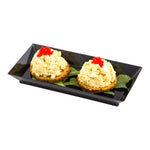 Elevate your appetizer presentation with our Bundle: Mini Serve 100 Rectangle Black 5-inch Plastic Plates with 100 Silver Plastic 4-inch Mini Spoons. This bundle includes a premium collection of disposable black rectangular plastic plates and shiny silver plastic mini spoons, perfect for enhancing the visual appeal of your culinary creations. The sturdy plastic plates feature raised edges, securely containing your delectable offerings while their sleek black finish and rectangular design lend a touch of sophistication to any plating. These 4-inch silver plastic spoons effortlessly complement the plates, their shiny finish designed to accentuate the presentation of your tantalizing dishes, from miniature tuna tartare to personal-sized strawberry shortcakes. Built with strong and sturdy handles, these spoons can handle hefty bites of polenta and big scoops of gelato with ease. The 5 inches in length by 2.5 inches in width plates and 4-inch spoons provide the perfect canvas for your culinary artistry. Each order includes 100 plastic plates and 100 mini spoons.