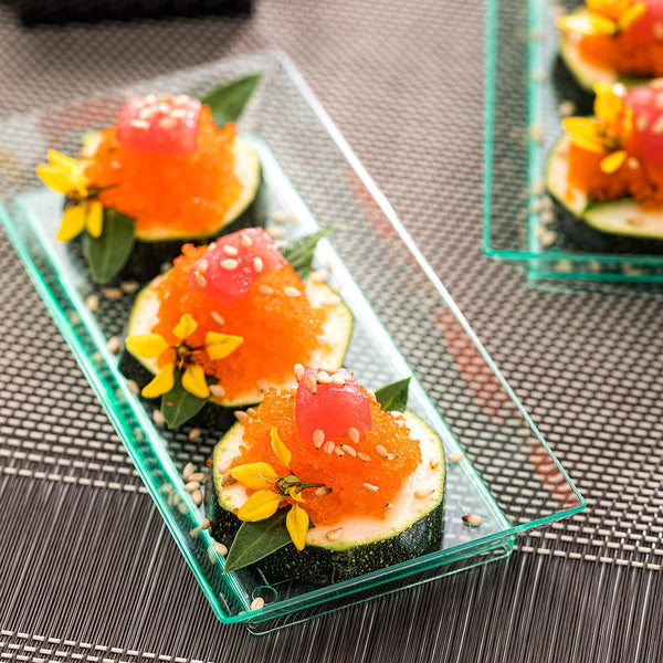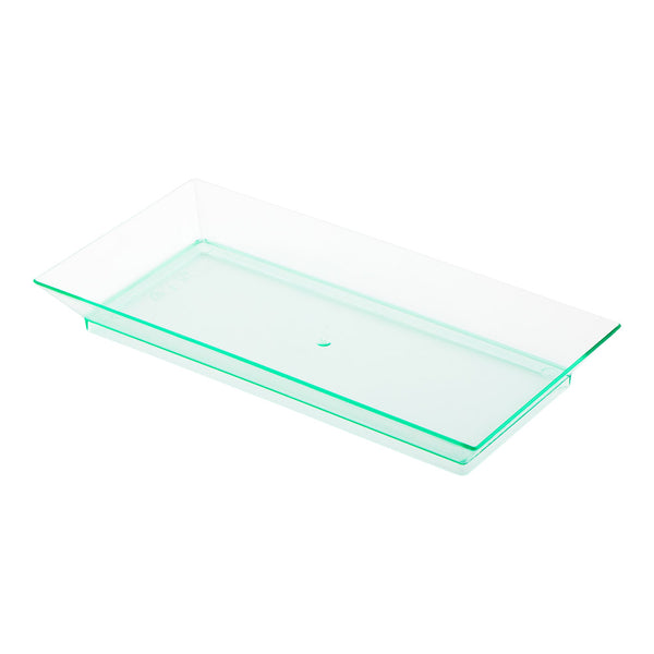 Elevate your dining presentation with our Bundle: Mini Serve 100 Rectangle Seagreen 5-inch Plastic Plates with 100 Silver Plastic 4-inch Mini Spoons. This bundle includes durable and disposable rectangular seagreen plastic plates and premium silver plastic mini spoons. The raised edges on these seagreen plates ensure food stays securely contained, while the transparent finish and rectangular shape enhance the presentation of your cuisine, making it chic. These disposable plates make event clean-up incredibly convenient serving option. Complementing the plates are the shiny silver plastic spoons, designed to effortlessly enhance the presentation of your tantalizing dishes with their sleek finish. The 4-inch spoons are the ideal size for miniature bites like tuna tartare or personal desserts, with sturdy handles that can handle heartier scoops of polenta or gelato. The seagreen plates measure 5 inches in length by 2.5 inches in width, and hold up to 2 ounces of food, while the spoons are 4 inches long, making them the perfect pairing for elevated appetizer displays. Each order includes 100 plastic plates and 100 mini spoons.