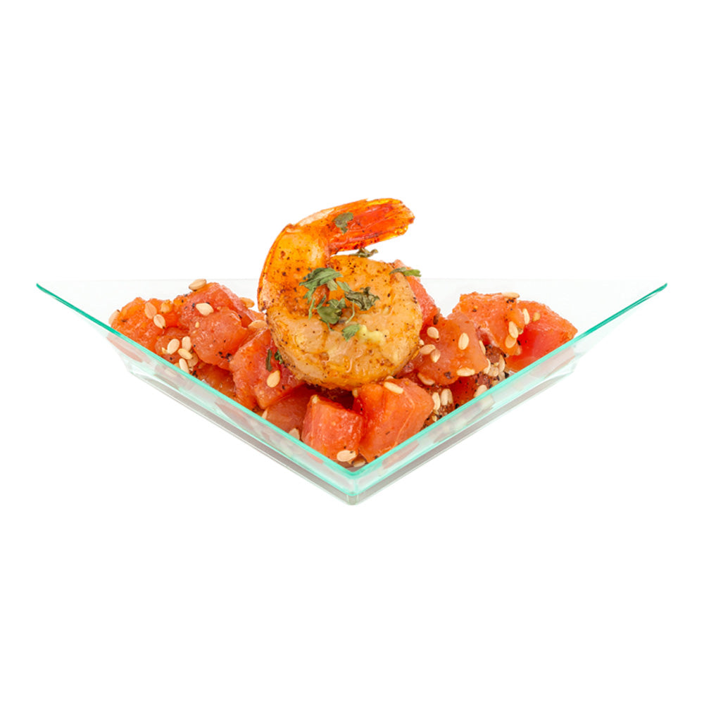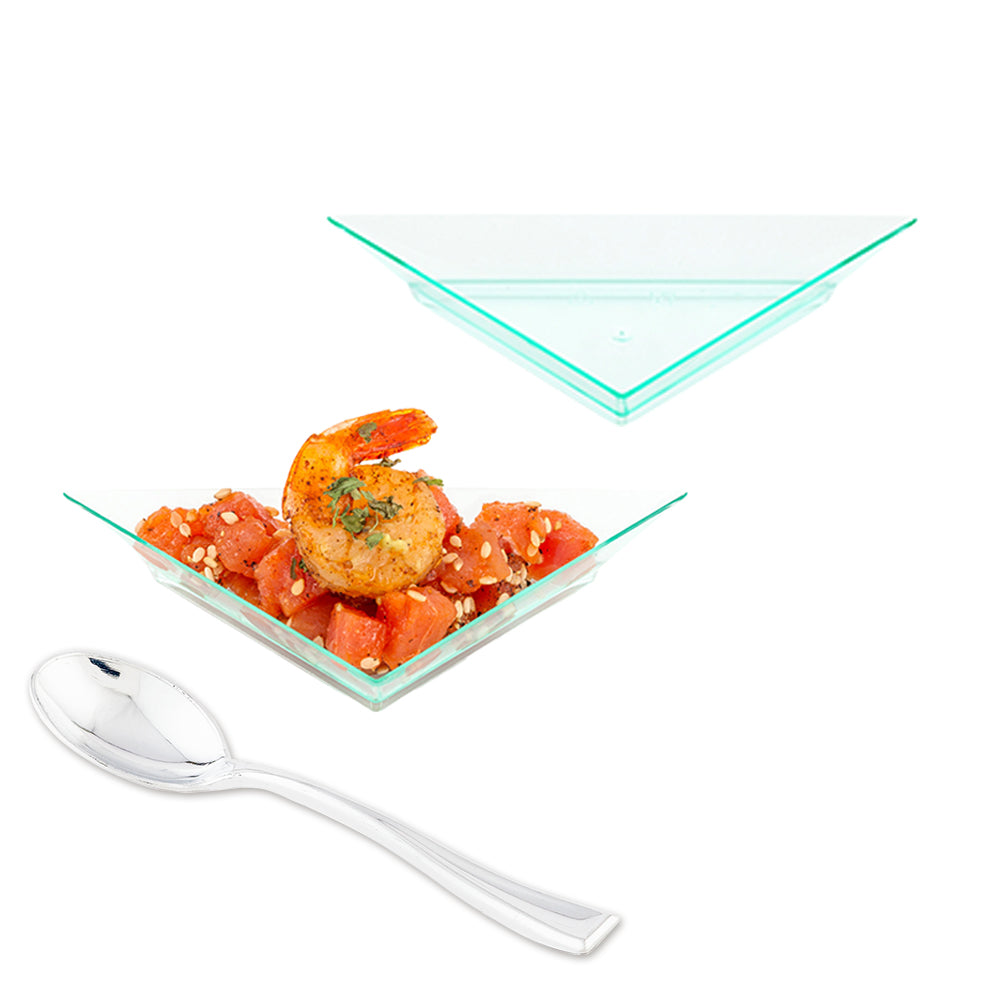 Make your events shine with our Bundle: Mini Serve Seagreen Plastic Mini Triangolo Appetizer Plates with Silver Plastic Mini Spoons, adding a sophisticated touch to any gathering. This bundle includes stylish seagreen plastic mini plates and sleek silver plastic mini spoons, ideal for presenting your finest creations. Both the recyclable plates and spoons offer easy cleanup, making post-event tidying a breeze. With their shiny silver finish, the mini spoons are perfect for serving bites of tuna tartare, strawberry shortcakes, and gelato with their sturdy handles. The 1-ounce plates measure 4 inches in length by 2 inches in width, and the spoons are 4 inches long, providing the perfect size for your appetizers and desserts. Each order includes 100 plastic plates and 100 mini spoons.