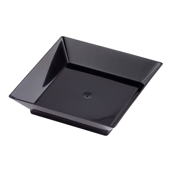 Elevate your miniature bites and hors d'oeuvres with our Mini Serve Square Black Plastic Mini Modern Plates with Silver Plastic Mini Forks. Featuring raised edge rims and a polished black finish, these square plates ensure a mess-free serving while adding a touch of geometric luxury to desserts and appetizers. Accompanying the serving dishes are these tasting forks that are designed with sturdy handles and a shiny silver finish to enhance presentations and stand up to substantial bites. Crafted from premium plastic, these dessert plates and 4-inch forks are disposable for easy cleanup, making them ideal for all venues. These dessert disposable plates measure 2.5 inches long by 2.5 inches wide by 0.5 inches tall, while the silver plastic forks measure 4 inches in length. Each order includes 100 plates and forks.