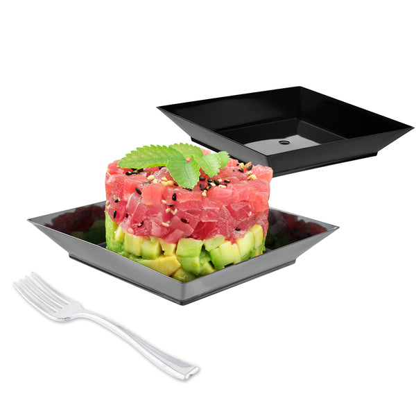 100 BLACK 3.9" PLASTIC SMALL MODERN PLATES AND 100 MINI FORKS