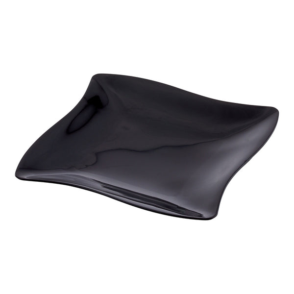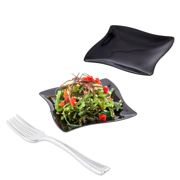 Bring your dinner party presentations to the next level with our Mini Serve Square Black Plastic Aqua Plates with Silver Plastic Mini Forks. Constructed from PS plastic, these disposable plates and fruit forks boast sturdy construction, making them ideal for serving various cold food items without any compromise on their structural integrity. These serving plates have a black finish with wavy edges that provide an elegant backdrop for displaying bite-sized fares. Designed with a slight dip in the center, these square black plates prevent sauces and toppings from spilling, ensuring a mess-free dining experience. Accompanying these plastic plates are these cake forks with a shiny silver finish that allows guests to sample dishes easily. These square plastic plates measure 3 inches in length by 3 inches in width, while the included plastic silver forks measure 4 inches in length. Each order includes 100 plates and 100 forks.