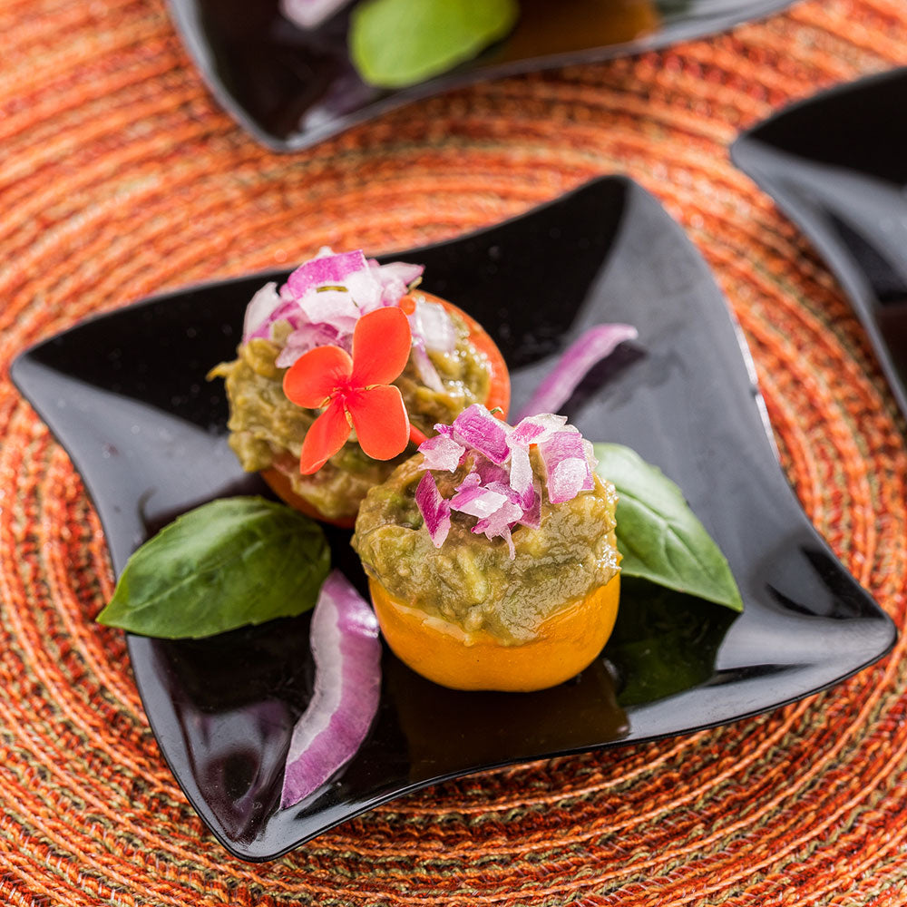 Make your events unforgettable with our Bundle: Mini Serve Square Black Plastic Aqua Plates with Silver Plastic Mini Spoons. This bundle features 100 stylish square black plates and 100 chic silver mini spoons, perfect for showcasing your bite-sized creations. The modern square design of the plates is ideal for upscale cocktail events, buffets, or weddings, adding a sophisticated touch to your presentation. Made from premium plastic, these durable plates hold food securely, while the elegant black finish provides a dramatic backdrop. The shiny silver mini spoons are perfect for desserts or snacks. These plates and spoons are recyclable to quickly clean up tableware after serving a large amount of guests. Measuring 3 inches in length and width, the plates hold up to 1 ounce and are perfect for appetizers. The 4-inch mini spoons are just right for delicate portions like tuna tartar. Each order includes 100 plastic plates and 100 mini spoons.