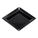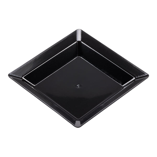 Serve up sophisticated appetizers and desserts in style with our Mini Serve Square Black Plastic Plates with Silver Plastic Mini Forks. Constructed from premium PS plastic, these serving plates and cake forks are designed to be disposable, perfect for a quick after-service cleanup. Featuring a sleek black finish and square shape, these food plates instantly elevate the presentation of gourmet fare, from ricotta gnocchi to seafood pasta. Paired with these shiny silver plastic forks, these appetizer plates create an upscale tablescape perfect for restaurants, catering events, and stylish soirees. With sturdy, reinforced handles, these disposable forks stand up to hearty portions of polenta and gelato. These square plates measure 4.24 inches in length by 4.25 inches in width by 0.5 inches in height, while the included tasting forks measure 4 inches in length. Each order includes 100 plates and 100 forks.