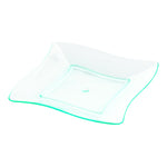Elevate your food presentations with our Mini Serve Square Seagreen Plastic Aqua Plates with Silver Plastic Mini Forks. Featuring robust PS plastic construction, these disposable plates and forks deliver reliable durability that caters impeccably to a wide range of chilled culinary treats while keeping their shape intact. These serving plates showcase a captivating clear seagreen finish with wavy edges, rendering a sophisticated canvas for showcasing bite-sized hors d'oeuvres. Designed with a slightly concave center, these square dessert plates avoid spillages, ensuring neater dining. These square plastic plates come with cake forks that facilitate easy nibbling. As a set, these plastic dishes and mini forks are disposable, offering an easy after-service cleanup. These appetizer dishes measure 3 inches in length by 3 inches in width, while the plastic silver forks measure 4 inches in length. Each order includes 100 plates and 100 forks.
