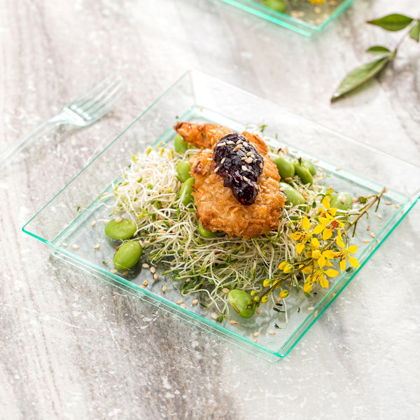 Serve in style with our Bundle: Mini Serve 100 Square Seagreen 5-inch Plastic Medium Modern Plates with 100 Silver Plastic 4-inch Mini Spoons for an effortlessly stylish and convenient serving experience. This bundle includes seagreen square plastic plates and silver plastic mini spoons, providing you with a complete tableware set. Constructed from premium plastic, these seagreen appetizer plates are highly durable, averting chips or breaks during use, while their distinctive square shaping and raised edges avoids food displacement and amplify presentation. The transparent seagreen tint effortlessly enhances the aesthetic appeal of your cuisine, making them perfectly suited for appetizers and small meals. The silver plastic mini spoons feature a shiny finish, designed to effortlessly enhance the presentation of your tantalizing dishes, with their sturdy handles standing up to hefty bites and big scoops. These plates measure 5 inches in length by 5 inches in width, while the spoons are 4 inches long, providing ample space for your culinary creations. Each order includes 100 plastic plates and 100 mini spoons.