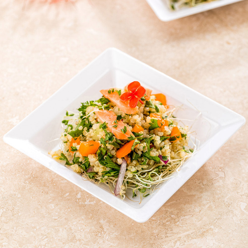 Complete your event setup with our Bundle: Mini Serve 100 Square White 4.25-inch Plastic Plates with 100 Silver Plastic 4-inch Mini Spoons. This bundle includes premium plastic plates and spoons, designed to avert breakage and ensure dependable use. These chic square plates feature a geometric design and raised edges, providing a unique touch to your food presentations while securely containing your culinary delights. Complemented by an elegant white finish, these plates exude luxury, perfectly suited for any event. The disposability of these plates introduces ease to the foodservice process and makes cleanup a breeze. Accompanying these plates are shiny silver plastic spoons, effortlessly enhancing the presentation of your tantalizing dishes with their sleek finish. These sturdy spoons, measuring 4 inches in length, are ideal for serving miniature bites, personal-sized desserts, and heartier scoops alike. Both the plates and spoons are made from premium plastic, making them a perfect choice for all kinds of food service establishments. The plates measure 4.25 inches in length by 4.25 inches in width, while the spoons are 4 inches long. Each order includes 100 plastic plates and 100 mini spoons.