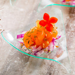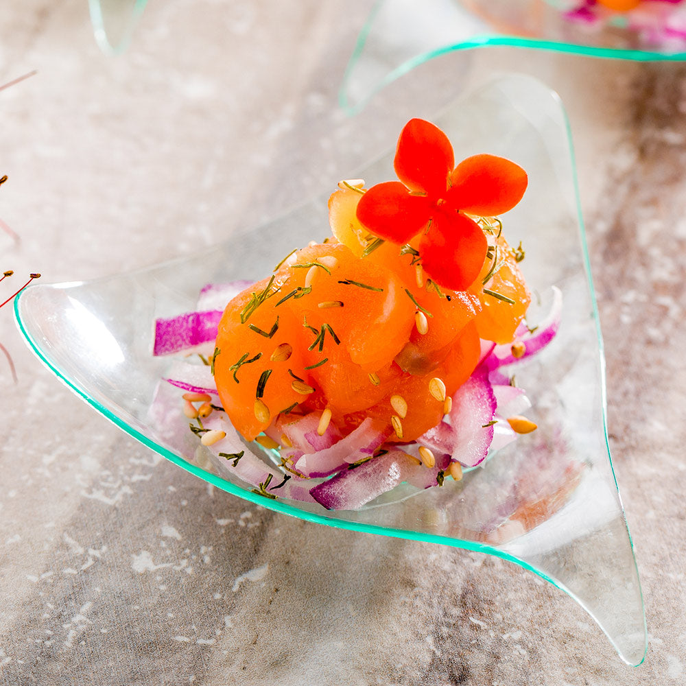 Elevate your event presentation with our Bundle: Mini Serve 100 Triangle Seagreen 3-inch Plastic Shooting Star Appetizer Plates with 100 Silver Plastic 4-inch Mini Spoons. This bundle includes distinctive seagreen plastic appetizer plates and premium silver plastic mini spoons. Crafted from durable plastic, these triangle plates are designed to withstand heavy use without chipping or breaking, making them perfect for serving appetizers, cold snacks, nuts, or tantalizing desserts. The unique wavy scalene design of these 3-inch miniature plates lends an elegant, refined touch to each single-serving presentation. Boasting a 1-ounce capacity, these petite plates are ideal for hors d'oeuvres and bite-sized treats. Complementing the plates are these shiny silver plastic mini spoons, expertly crafted to enhance the visual appeal of your tantalizing dishes. These plates measure 3 inches in length by 3 inches in wide. Measuring 4 inches in length, these sturdy spoons can effortlessly accompany miniature tuna tartare, personal-sized strawberry shortcakes, hefty bites of polenta, or big scoops of gelato. Made from premium plastic, both the plates and spoons are conveniently disposable and recyclable, making them a perfect choice for eco-conscious cafes, venues, and clients. Each order includes 100 plastic plates and 100 mini spoons.