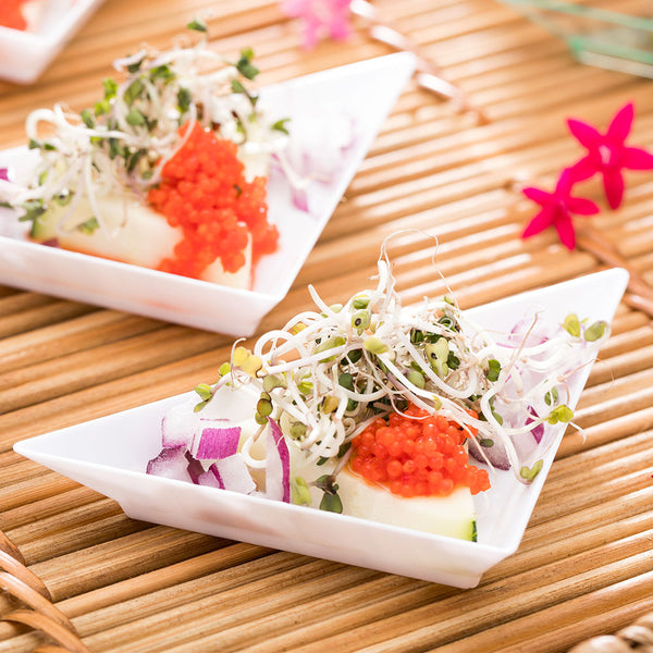 Create an unforgettable dining experience with our Bundle: Mini Serve White Plastic Mini Triangolo Appetizer Plates with Silver Plastic Mini Spoons, perfect for elevating your culinary presentations. This bundle includes our 100 white mini plates and 100 sleek silver mini spoons, designed to enhance the appeal of your beautifully crafted appetizers. The sturdy mini spoons are ideal for scooping up delicate treats like tartare or rich desserts such as gelato. Both the plates and spoons are recyclable, ensuring easy cleanup after events. The 1-ounce plates measure 4 inches in length by 2 inches in width, while the spoons are 4 inches long, making them the perfect size for individual servings. Each order includes 100 plastic plates and 100 mini spoons.