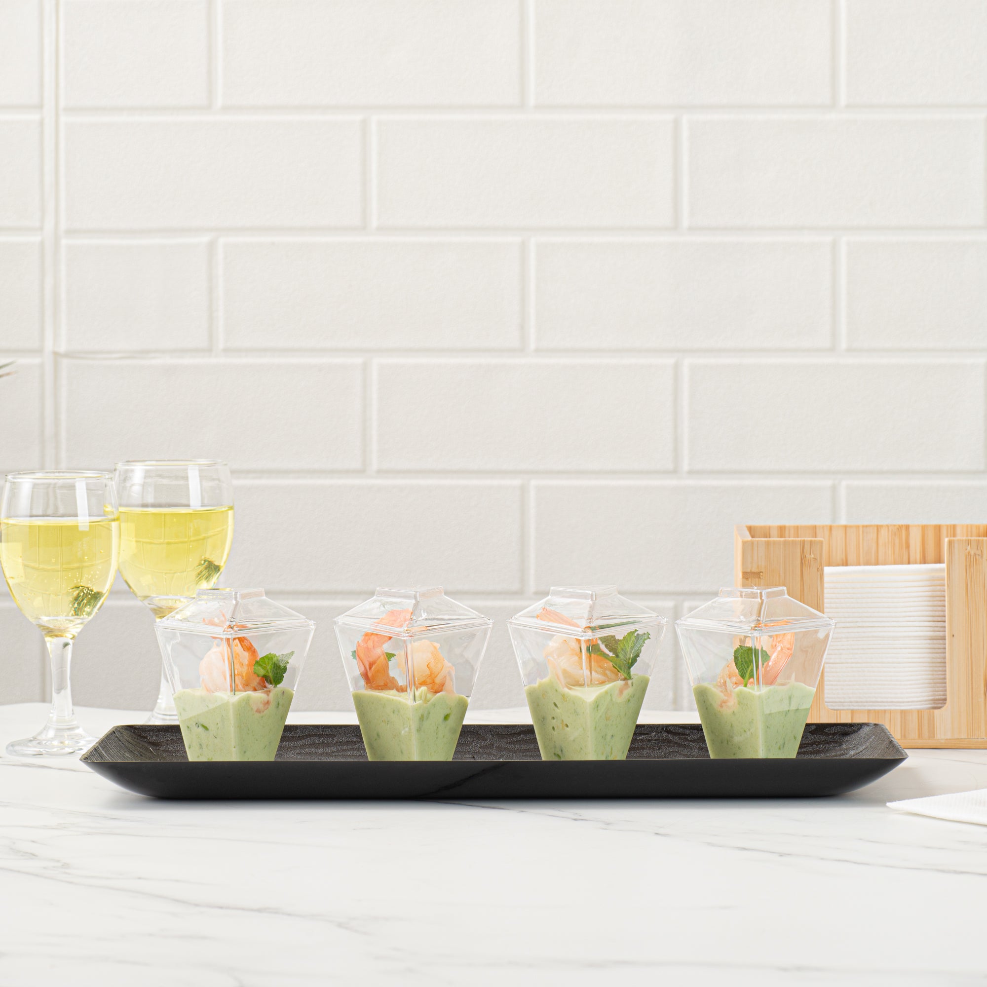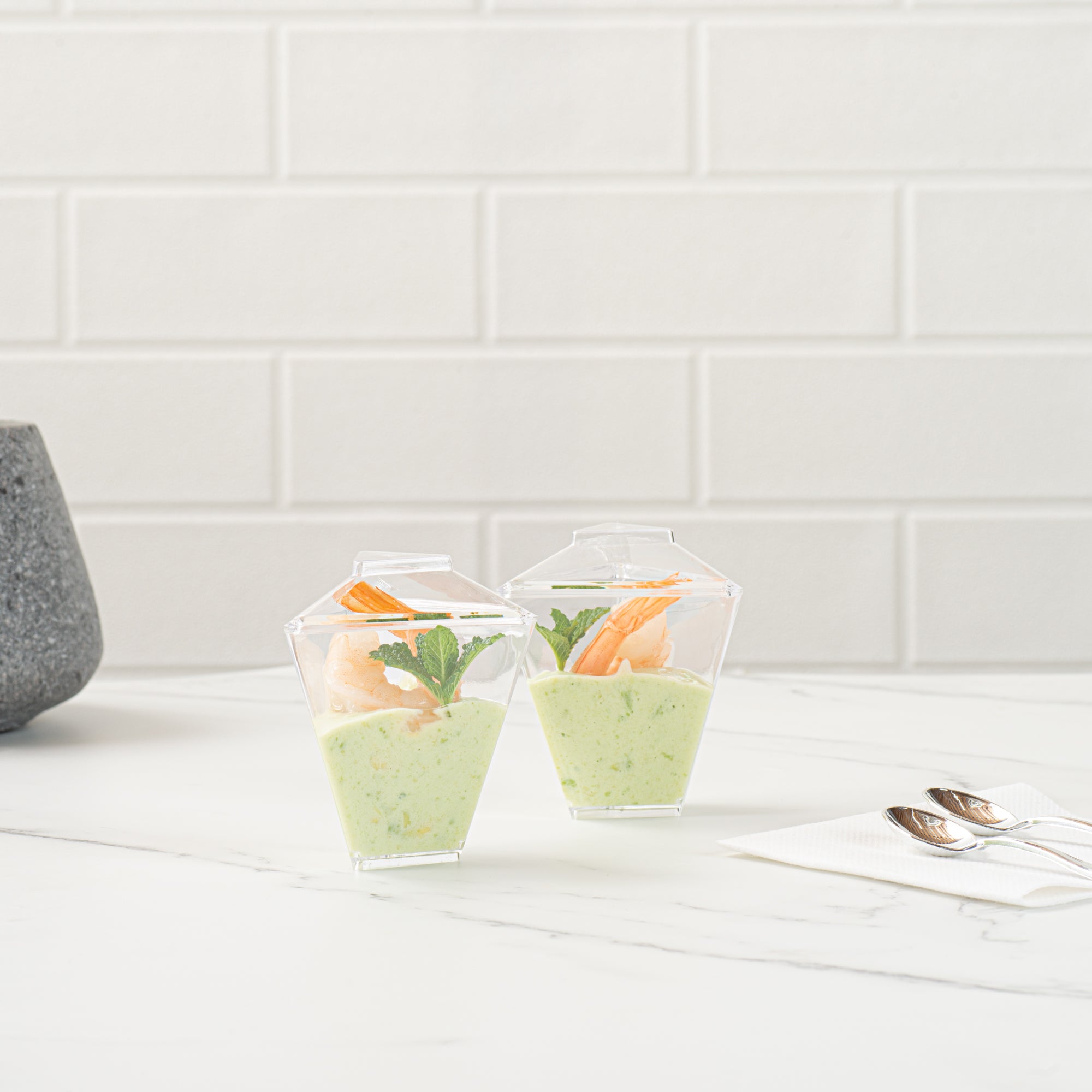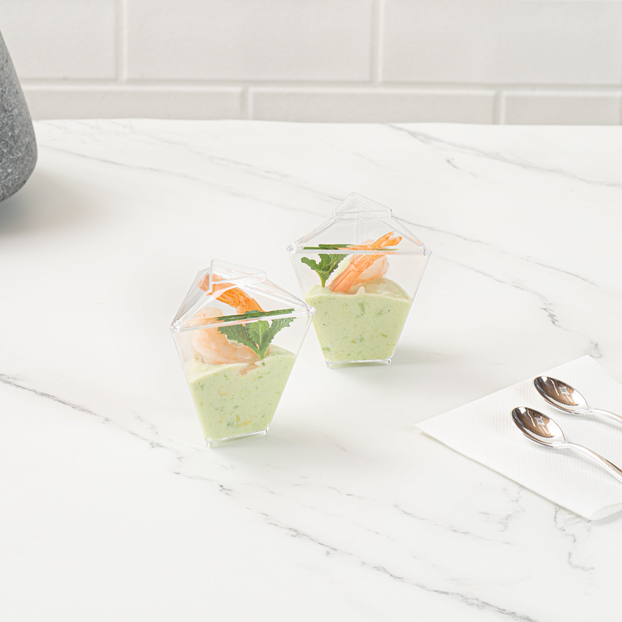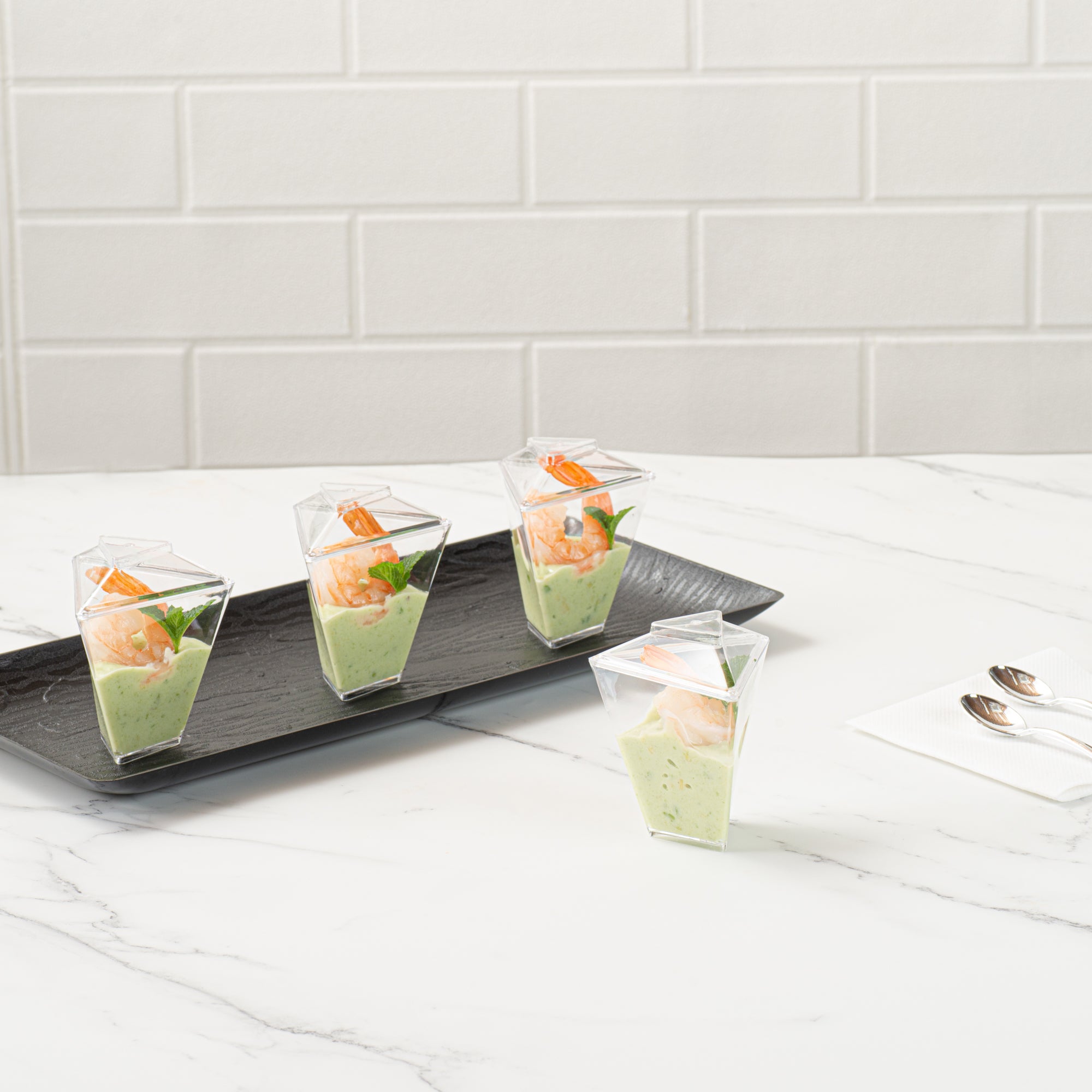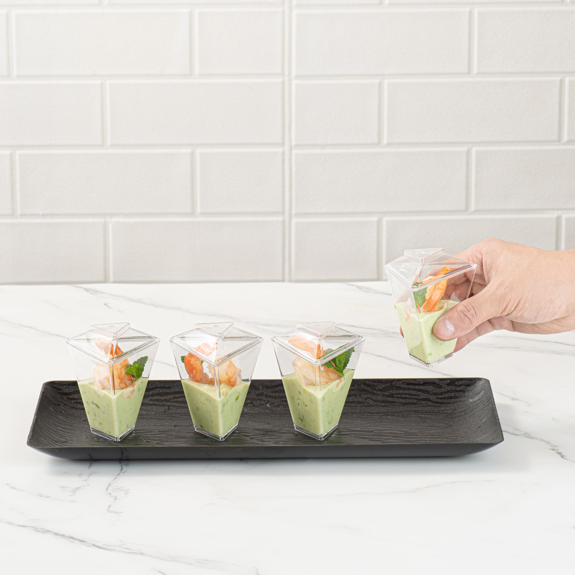Enhance your event's appeal with elegant disposable serveware. Mini Serve Mini Dessert Cups offer an eye-catching flared triangle design that elevates culinary presentations, making them perfect for mini dessert cups at upscale gatherings. Crafted from durable plastic, these clear containers ensure that outdoor events proceed without the fear of breakage, making them ideal for dessert shooters in bustling settings. With dimensions of 2.91 inches in length, 2.52 inches in width, and 3.46 inches in height, these clear plastic dessert containers are specifically designed to accommodate cold foods while maximizing display impact. The disposable convenience of these cups streamlines post-event cleanup, allowing catering teams to focus on guest satisfaction. Invest in these versatile dessert cups to enhance your service efficiency and presentation quality. Sold in a 25 count box.