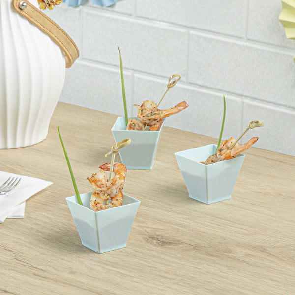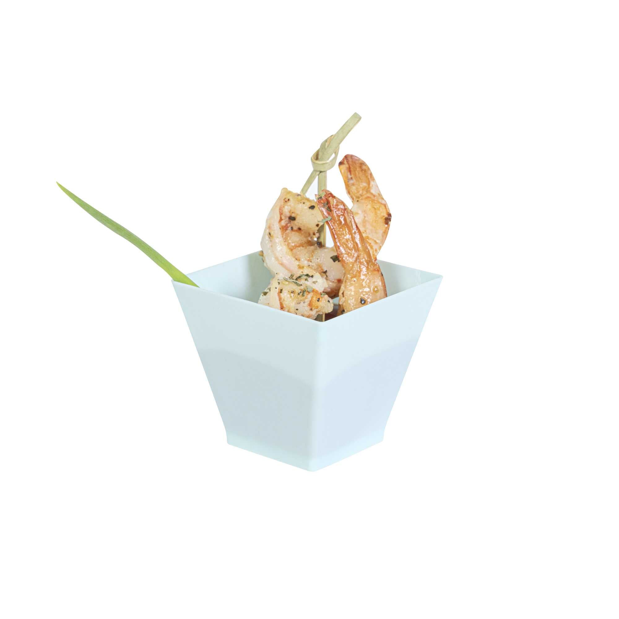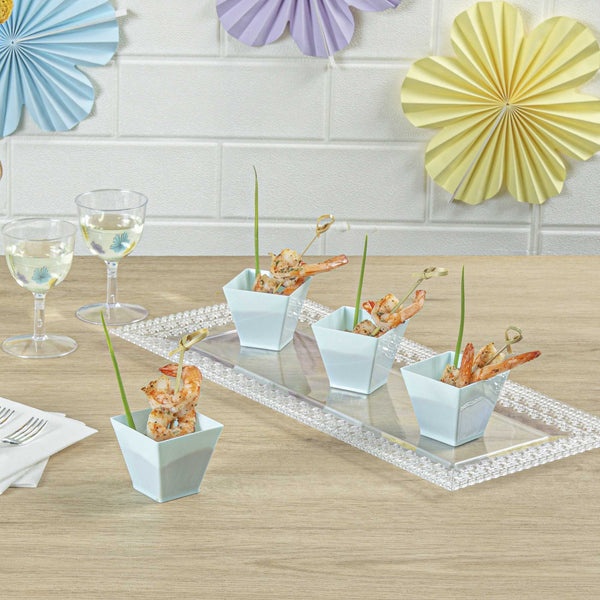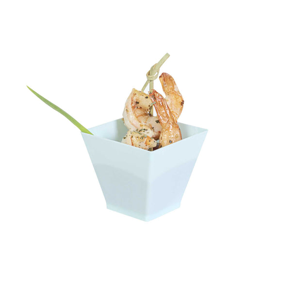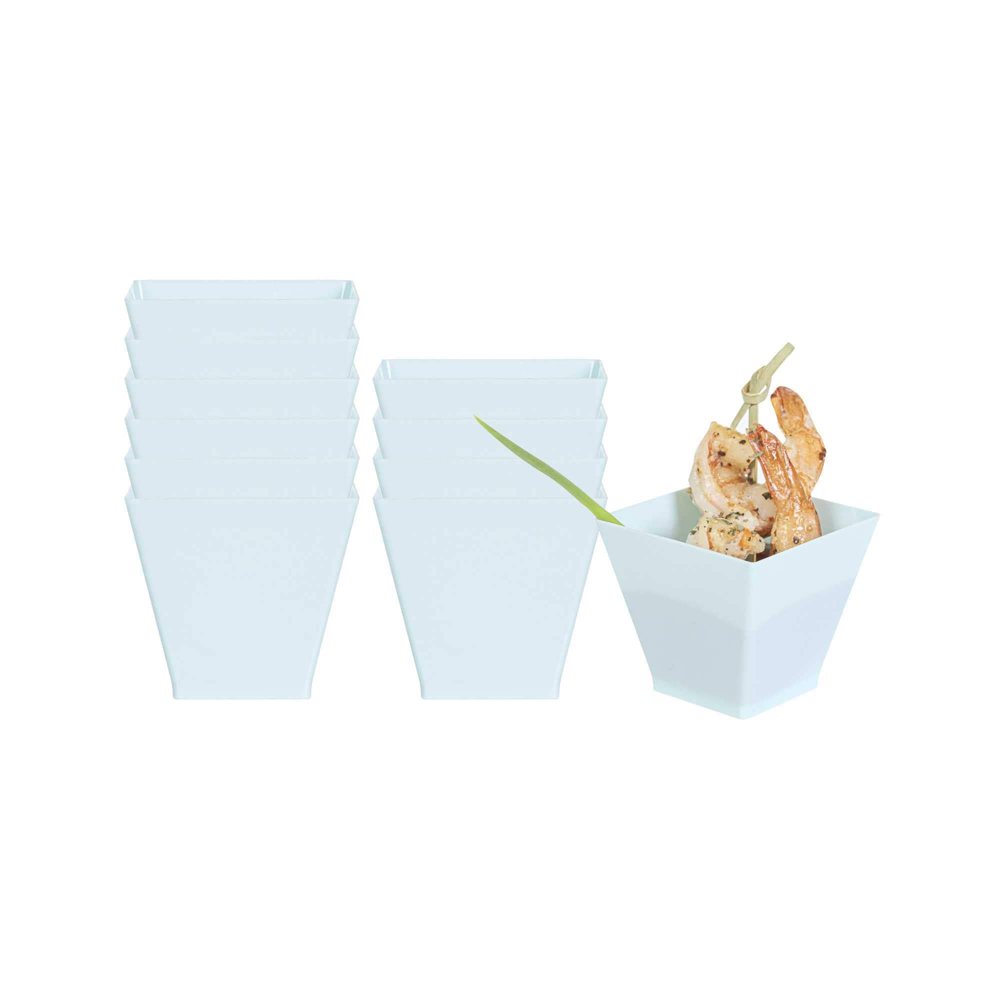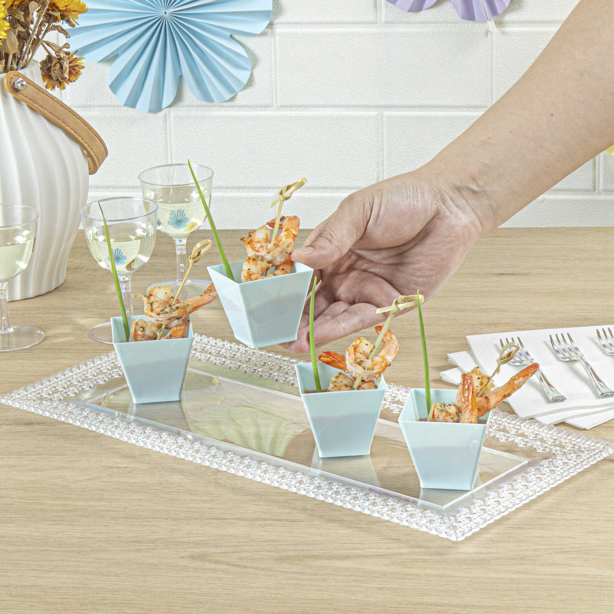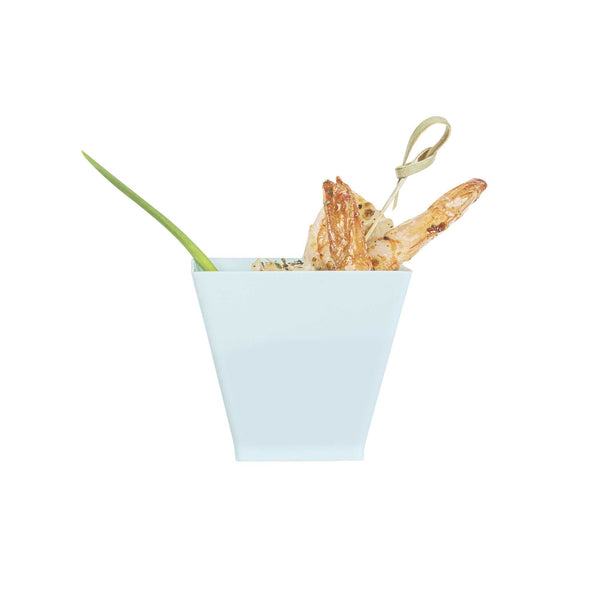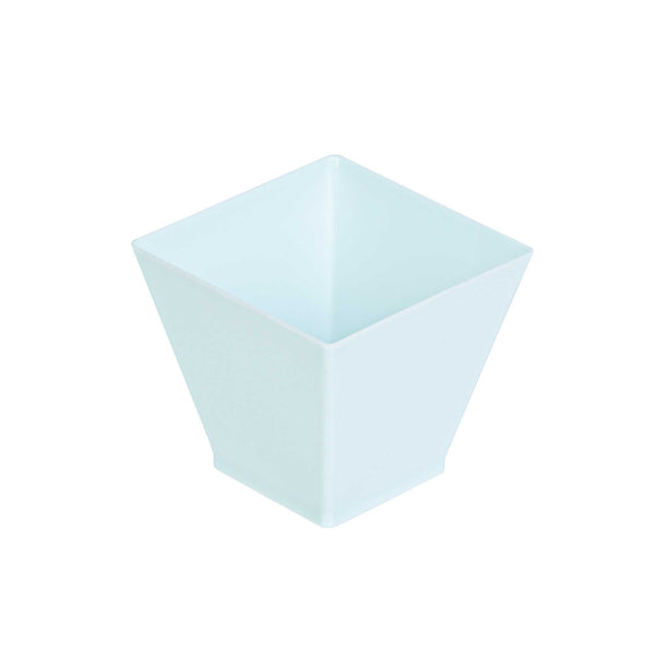 Personalize your presentation using our Mini Serve 2-Ounce Square Baby Blue Plastic Mini Kova Cups. These kova cups are meticulously crafted for durability, ensuring a seamless event experience. Featuring smooth rims, these plastic mini cups ensure a pleasurable dining experience. The distinctive baby blue hue of these recyclable mini plastic cups brings an elegant and fun element to your presentation, making them a fitting choice for any occasion. Tailored for bite-sized appetizers, desserts, or beverages, these 2-ounce treat cups are a fantastic addition to your menu. Designed for one-time use, these disposable snack cups streamline the cleanup process, leaving you with more time to enjoy your event. Pair these cups with our Mini Serve matching lids (SKU: RWP0305C) to protect the contents Measuring 2 inches in length by 2 inches in width by 1.75 inches in height, these disposable kova cups are efficient for storage purposes. Sold in a 100 count box