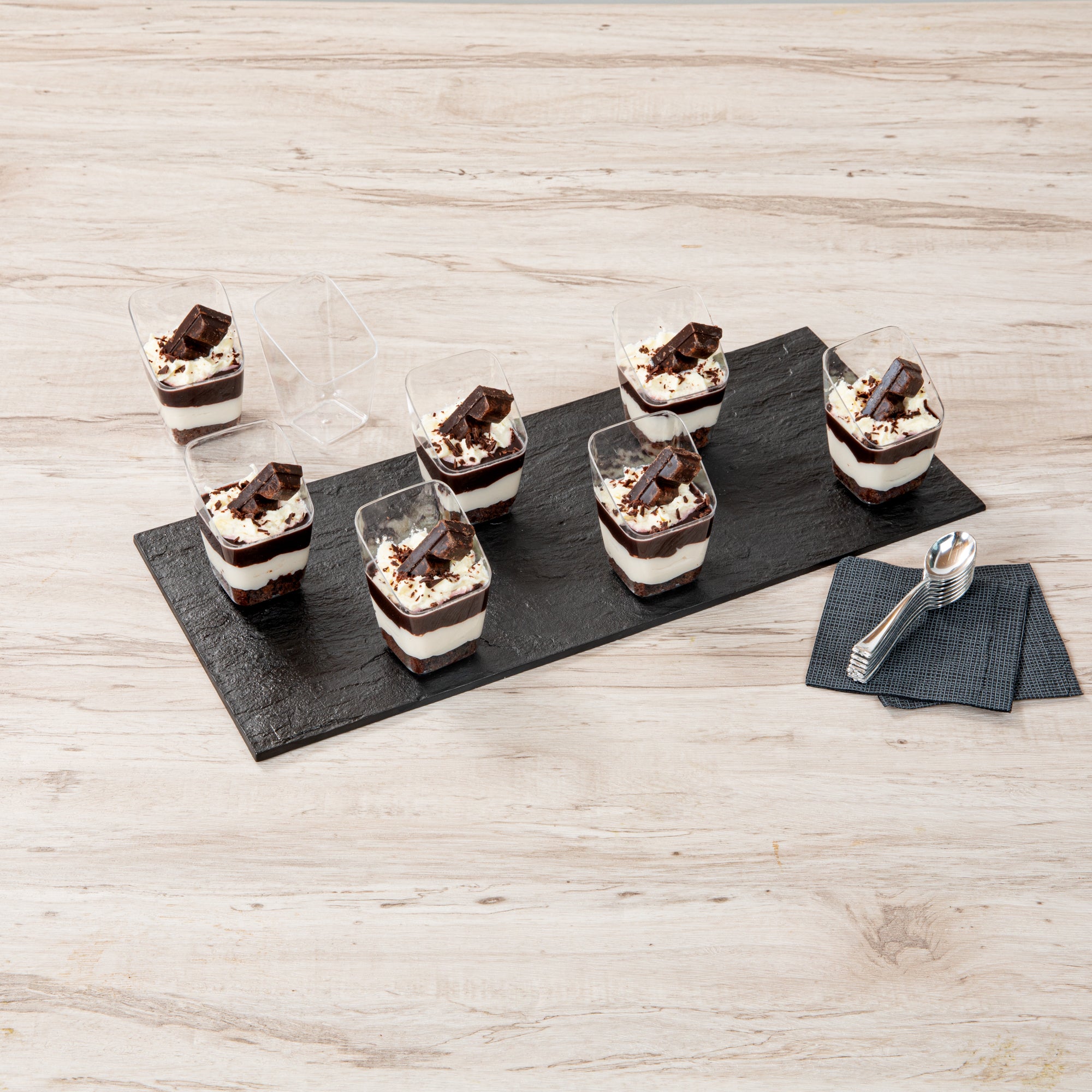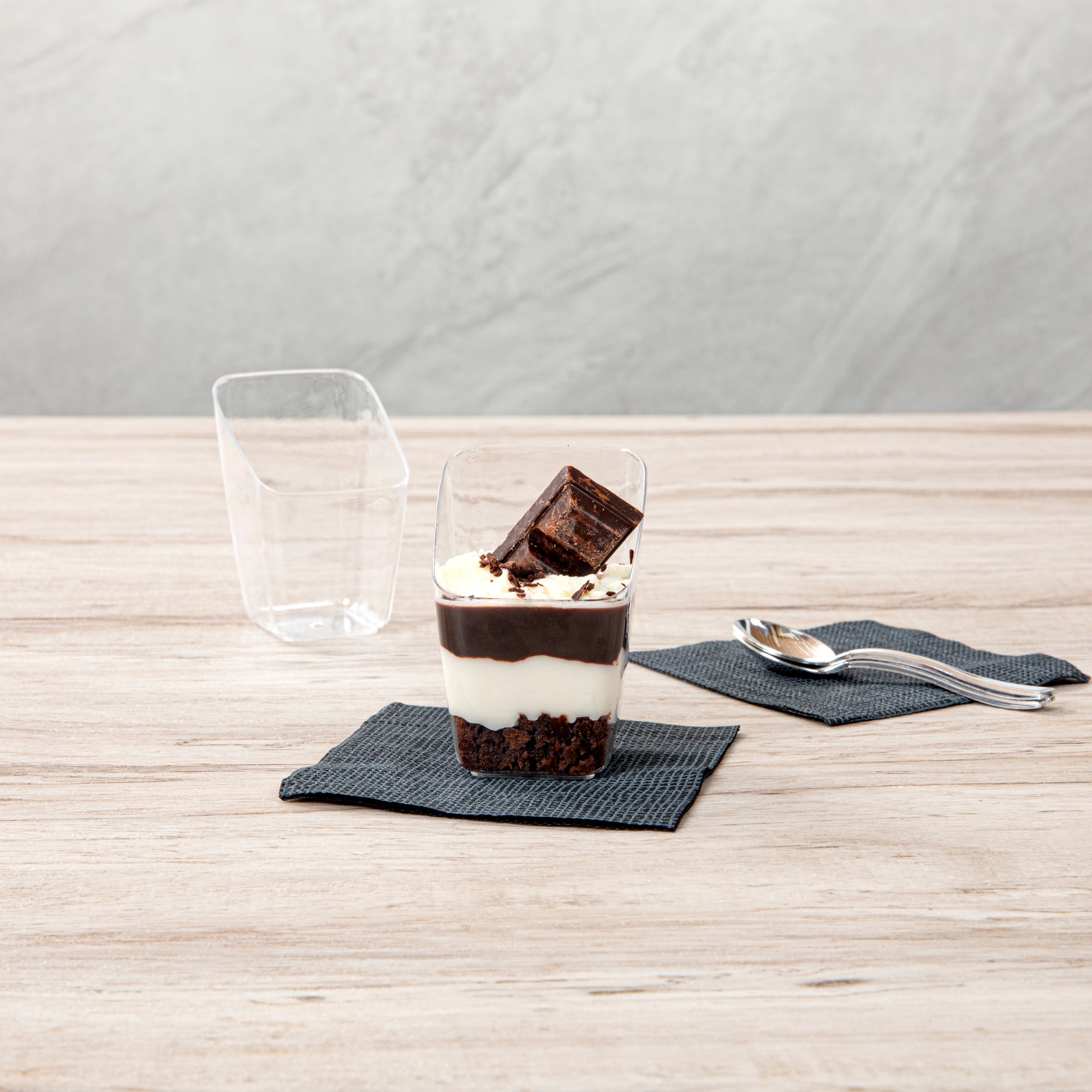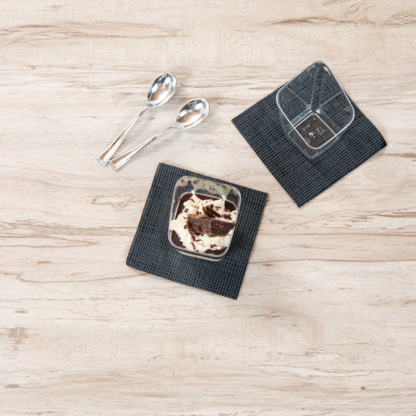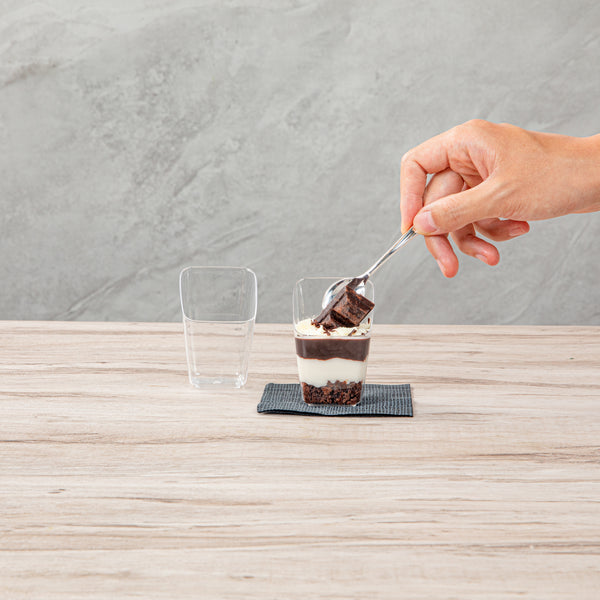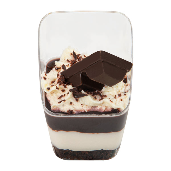 Present your desserts elegantly with our Mini Serve 2-ounce Square Clear Plastic Dessert Cups. These recyclable plastic dessert cups are made from sturdy PS plastic, ensuring they withstand even the busiest events. The modern slant design adds a touch of sophistication to every serving, making these clear dessert cups a perfect addition to any dessert table. Suitable for handling cold foods, these clear recyclable plastic dessert cups can perfectly showcase ice cream, mousse, or fruit salads. The clear finish of these dessert cups enhances the visual appeal of your desserts. These clear dessert cups are stackable and can be easily stored, maximizing your space. Measuring 2.5 inches in length by 2.5 inches in width by 3 inches in height, these 2-ounce dessert cups are compact yet provide adequate capacity for delectable treats. Sold in a 100 count box.