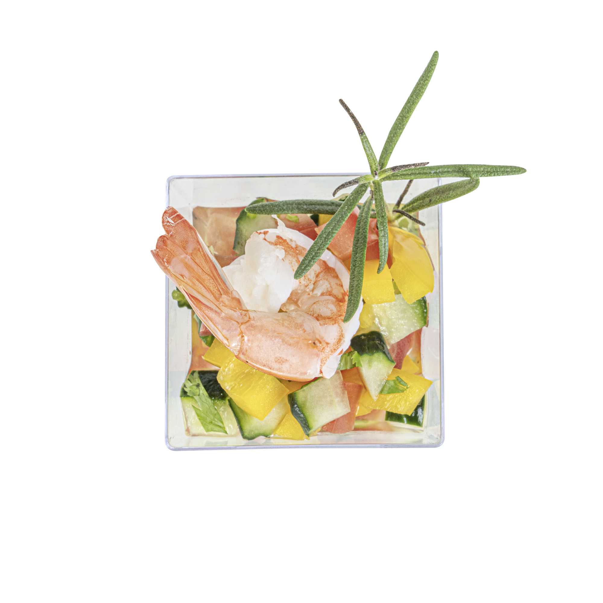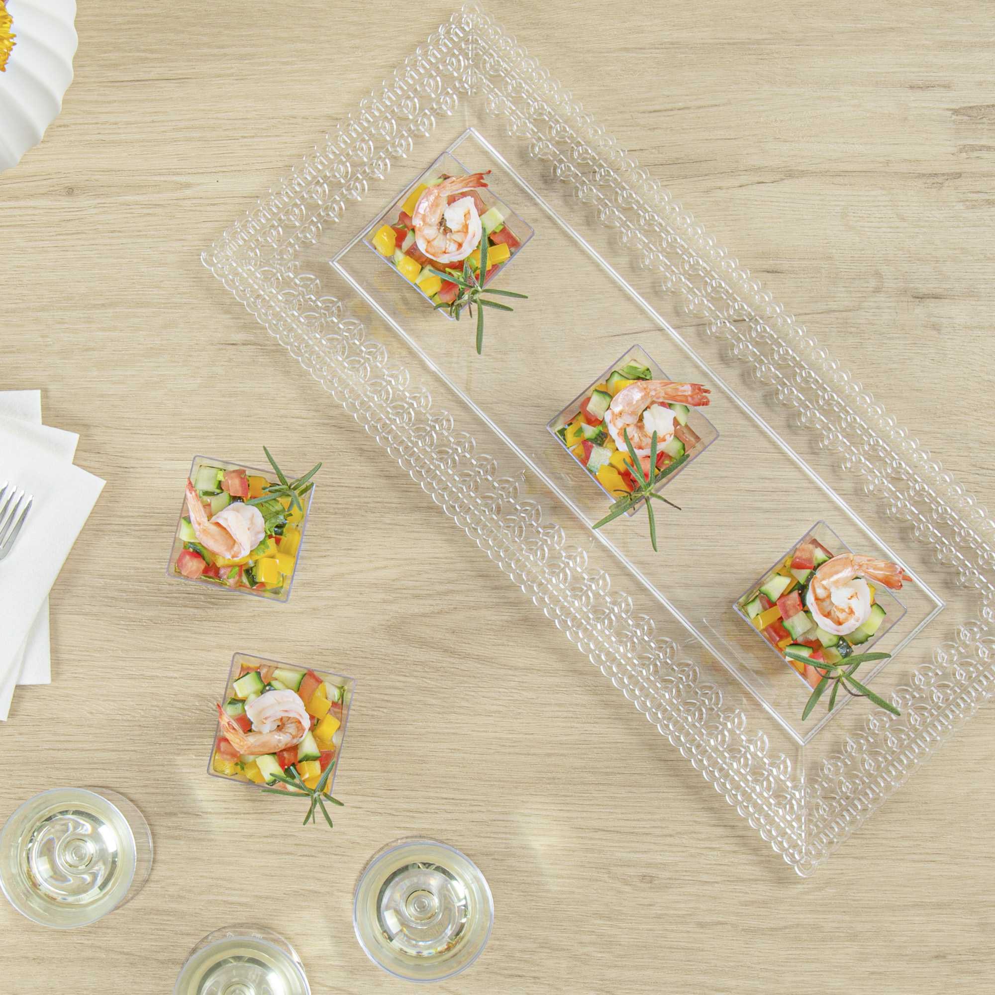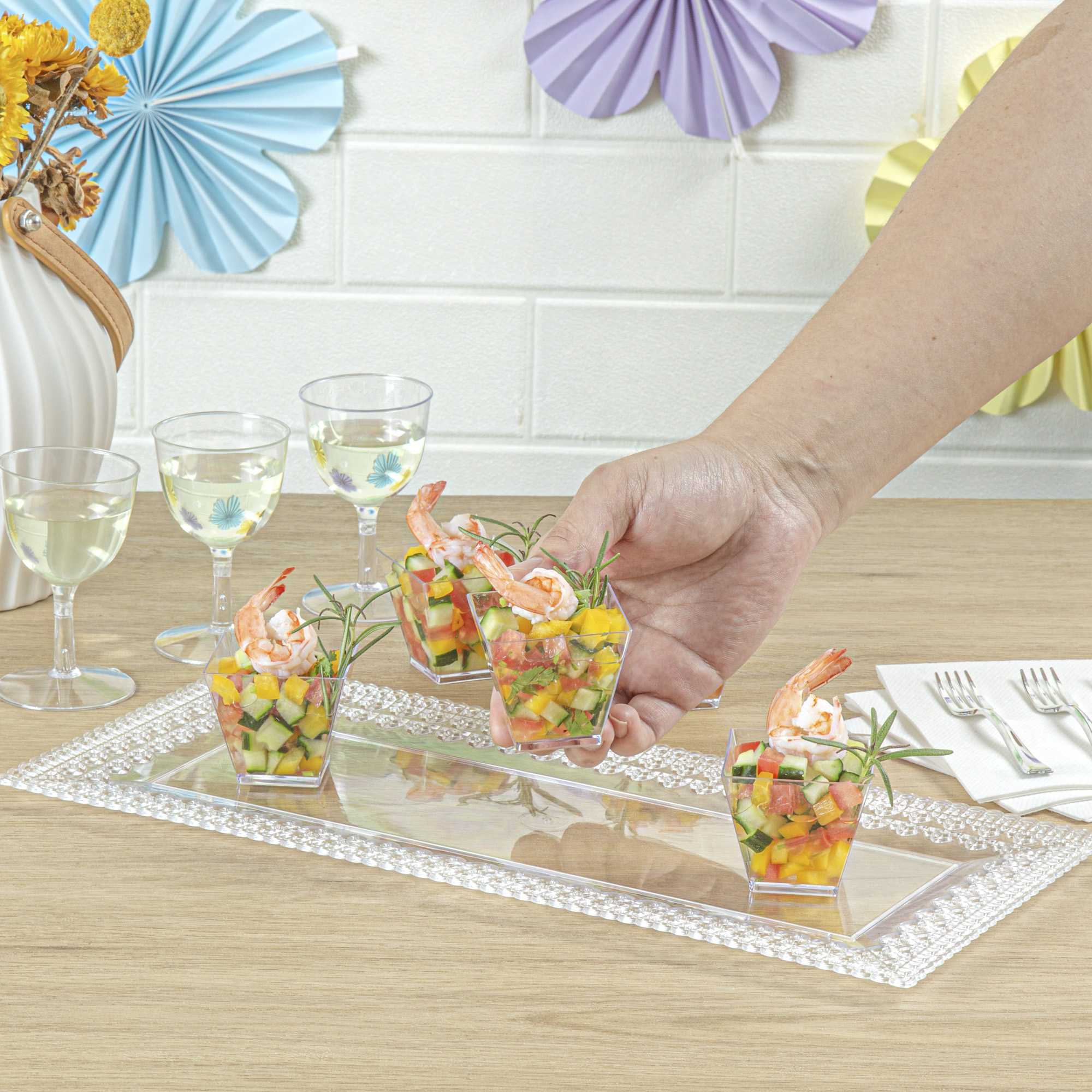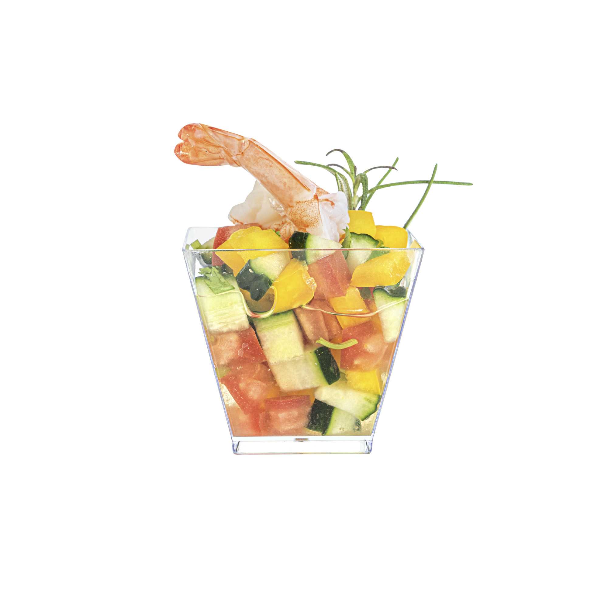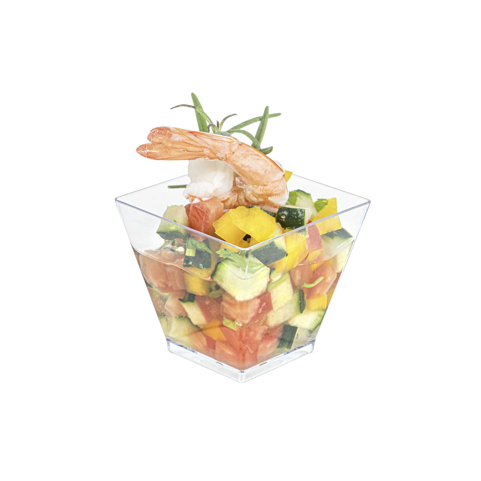 Present your delightful treats in our Mini Serve 2-Ounce Square Clear Plastic Mini Kova Cups. Made from robust material, these clear kova cups promise enduring performance at any gathering. The smooth-rimmed design of these plastic cups ensures a secure and enjoyable dining experience. The transparent finish of these clear snack cups lets the menu item shine, adding elegance and style to casual and upscale events. Perfect for serving bite-sized desserts, appetizers, or beverages, these 2-ounce kova cups cater well to small portion servings. Disposable and conveniently single-use, these recyclable plastic square cups make the post-event cleaning effortless. Pair these cups with our Mini Serve matching lids (SKU: RWP0305C) to protect the contents. These disposable kova cups are 2 inches long by 2 inches wide by 1.75 inches tall, allowing easy storage. Shipped in a 20 count box.