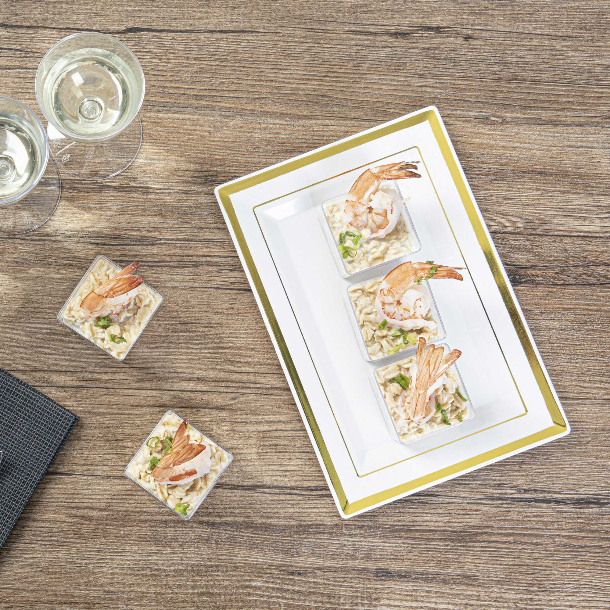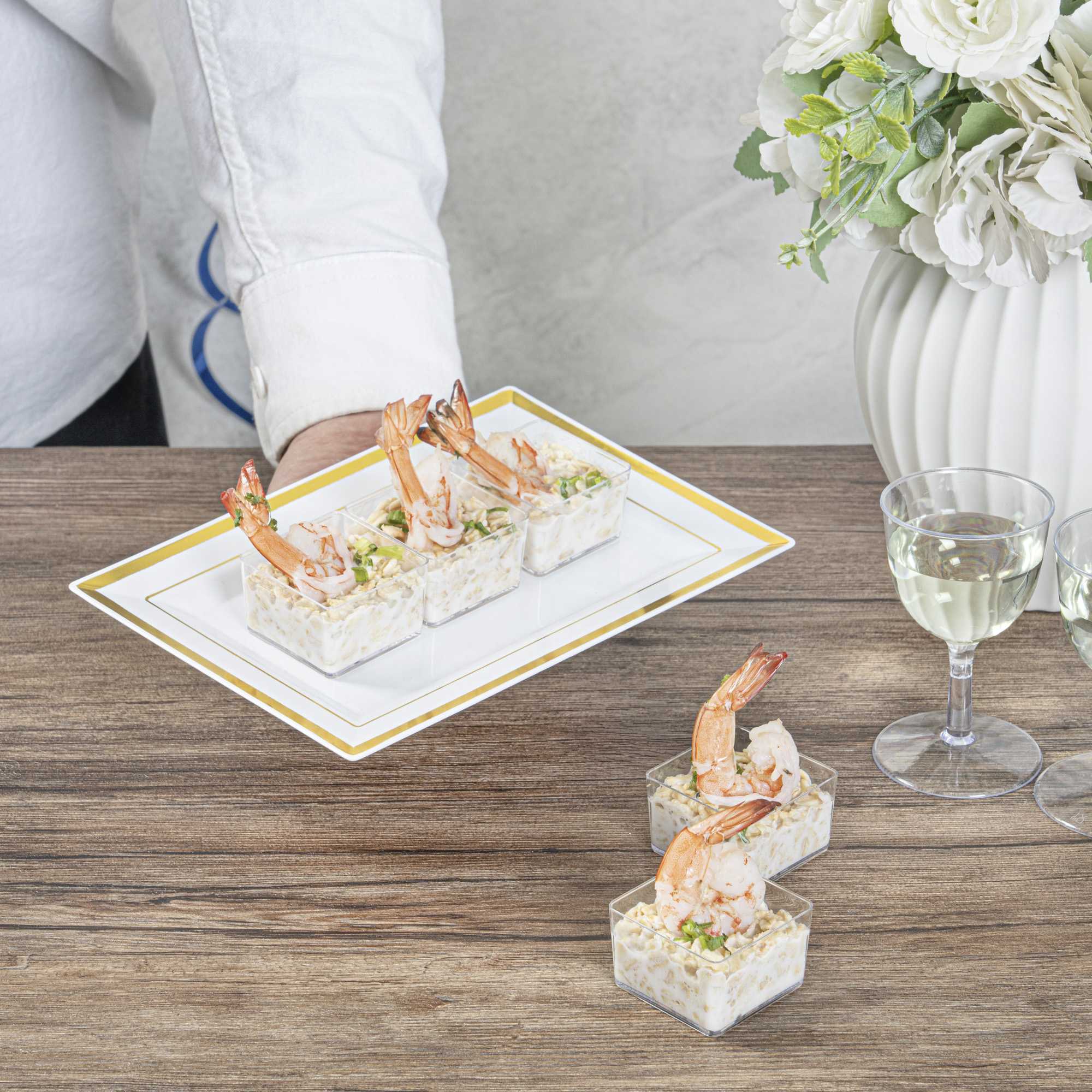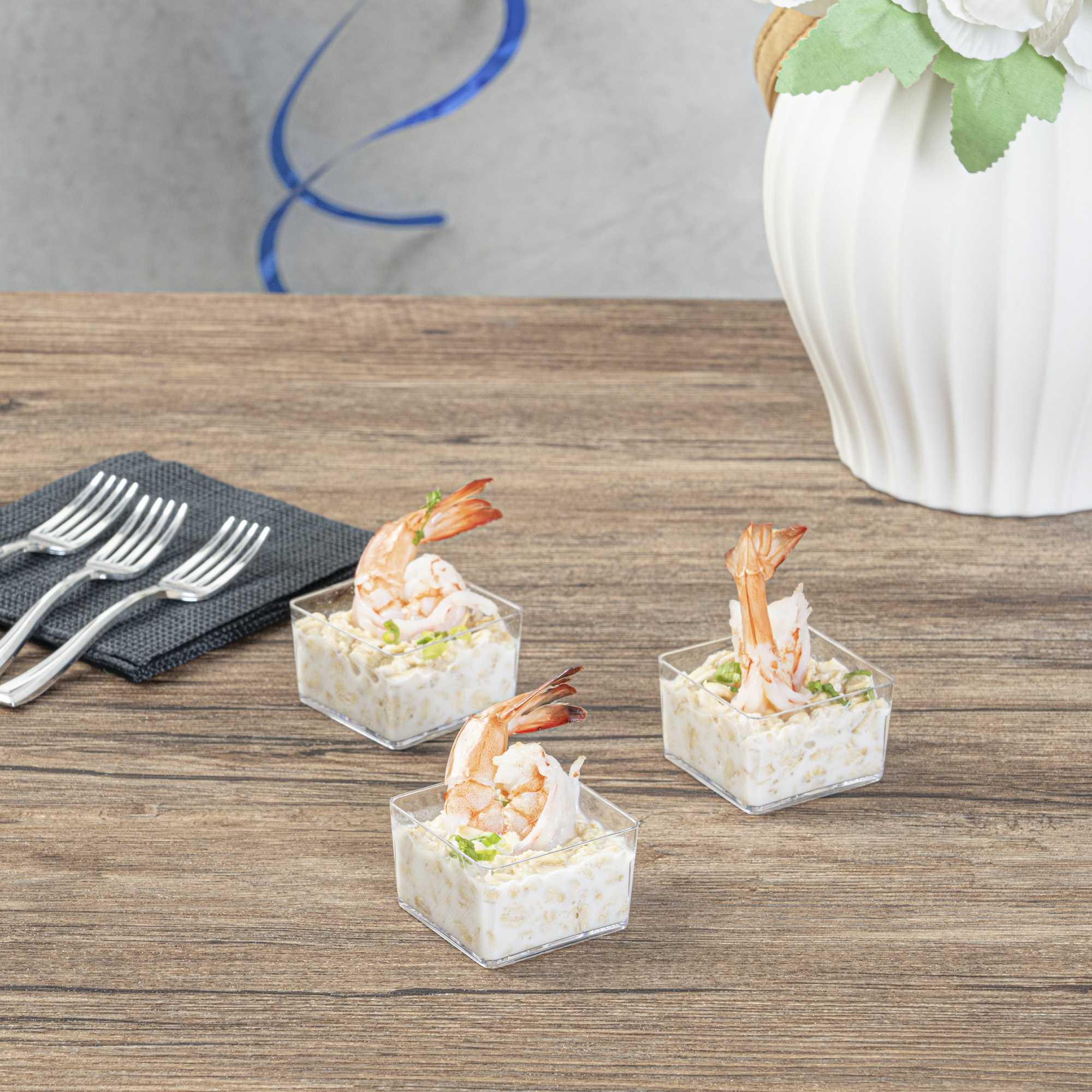 Serve desserts elegantly in our Mini Serve 2-ounce Square Clear Plastic Short Quadrato Cups. Made from sturdy plastic material, these clear dessert cups promise exceptional durability. The straight sides and square base of these clear dessert cups contribute to a classy cube design. These 3-ounce dessert bowls are reinforced with thick walls to prevent any cracking or breaking during usage. With a contemporary transparent design, these square dessert cups offer a chic aesthetic that is perfect for sophisticated events. The recyclability and disposability of these cubic plastic dessert bowls marry sustainability with easy cleanup post-event. With a capacity of 2 ounces and measuring 1.75 inches in length by 1.75 inches in width by 1 inch in height, these plastic dessert bowls are perfectly sized for individual treats and securely contain contents. Sold in a 100 count box.