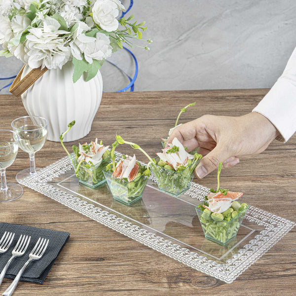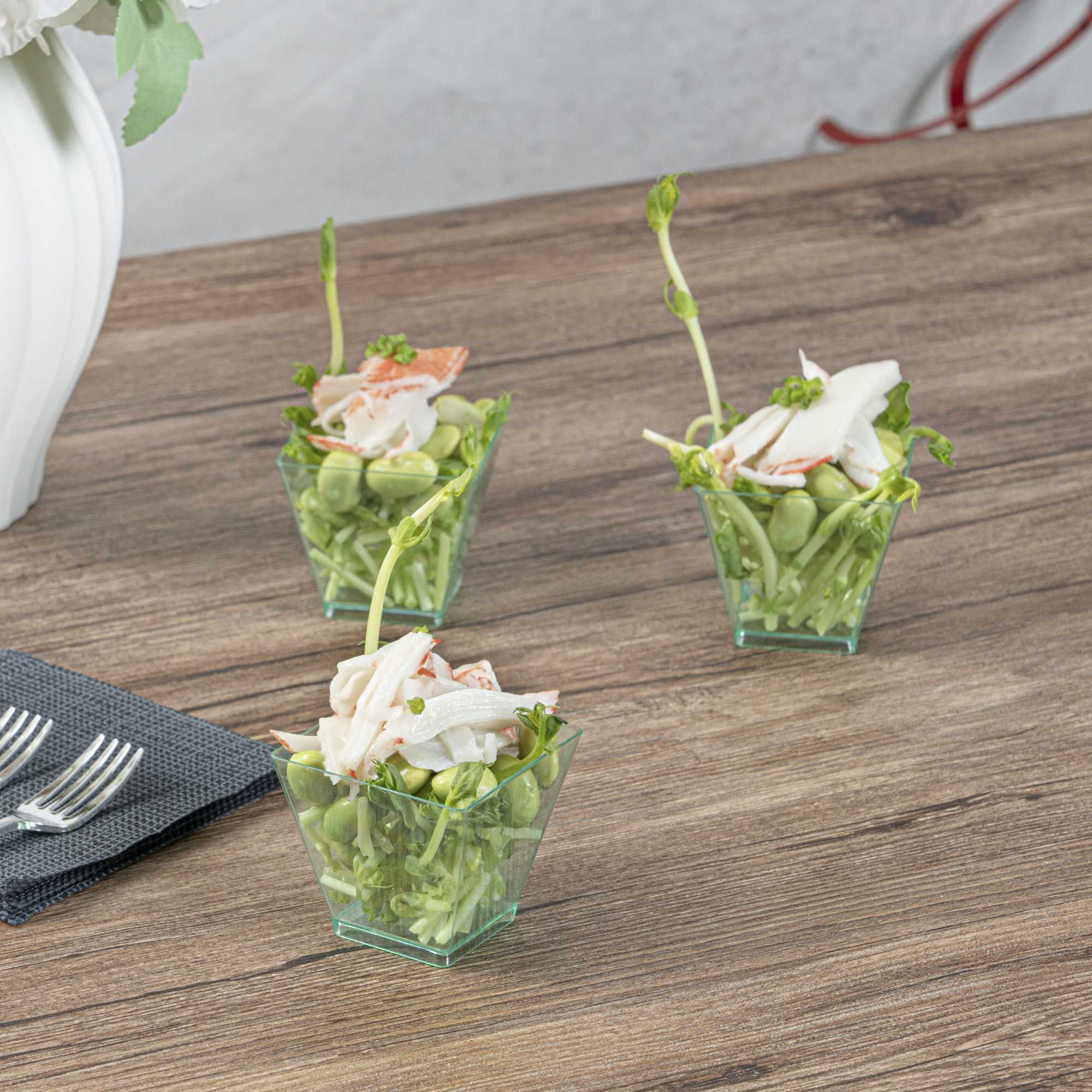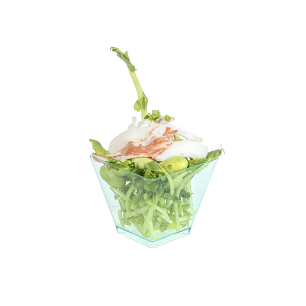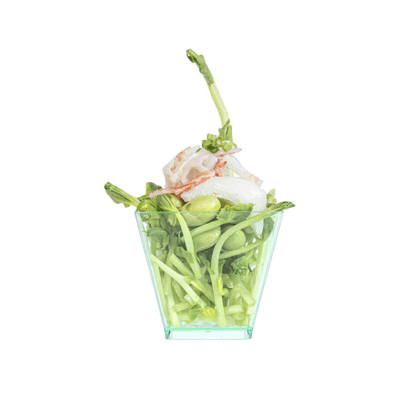 Customize your presentation with our Mini Serve 2-Ounce Square Seagreen Plastic Mini Kova Cups. Durably constructed, these seagreen kova cups are built to last, ensuring your event runs smoothly. The smooth rims of these plastic mini cups make for a comfortable eating experience. The unique seagreen color of these plastic cups adds an elegant, ocean-like touch to your presentation, fitting for any occasion. Ideally designed for bite-sized appetizers, desserts, or drinks, these 2-ounce treat cups are a great addition to your menu. Designed for single-use, these disposable snack cups ensure an easy cleanup process. Pair these cups with our Mini Serve matching lids (SKU: RWP0305C) to protect the contents. Measuring inches long by 2 inches wide by 1.75 inches tall, these recyclable kova cups are efficient for storage. Sold in a 20 count box.