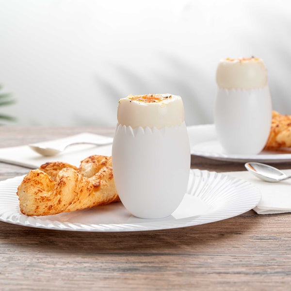 Present desserts with our Mini Serve 2-ounce White Plastic Cracked Uovo Cups. Crafted from high-quality plastic, these white cups are durable and ideal for serving cold food items at your restaurant. These dessert cups can hold up to 2 ounces and are ideal for serving small portions of your appetizers. The inventive cracked egg design of these appetizer cups makes for an imaginative way to serve desserts, appetizers, ice cream sundaes, and so much more. With a classic white finish, these disposable cups create an aesthetically pleasing food presentation. For an easy cleanup, these plastic cups are disposable. These decorative cups measure 1.75 inches in diameter by 2.25 inches in height and can hold up to 2 ounces. Sold in a 100 count box.