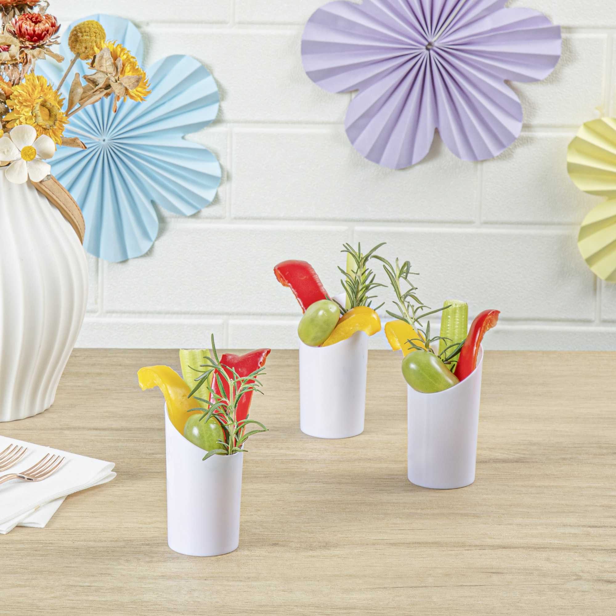 Upgrade your drink offerings with our Mini Serve 3-Ounce Round White Incline Shot Glasses. Constructed from top-notch plastic, these shot glasses are durable enough to endure bustling celebrations and prolonged evening affairs. The distinctive incline silhouette of these party glasses imparts an immediate elegant touch to your beverages, making them more enticing to your guests. With an immaculate white finish, these plastic shot glasses highlight your colorful mixes, boosting complete indulgence. The one-time-use feature of these incline shot glasses simplifies after-party tidying up, ensuring you get to savor the event just as your guests do. To facilitate storage and transportation, these white plastic shot glasses feature a stackable design, saving you both space and effort. Despite their stylish allure, these single-use shot glasses are sturdy, holding up to 3 ounces for precise servings. The compact measurements of 2 inches in diameter by 3.25 inches in height make these recyclable plastic glasses ideal for a variety of functions and gatherings. Sold in a 20 count box.
