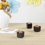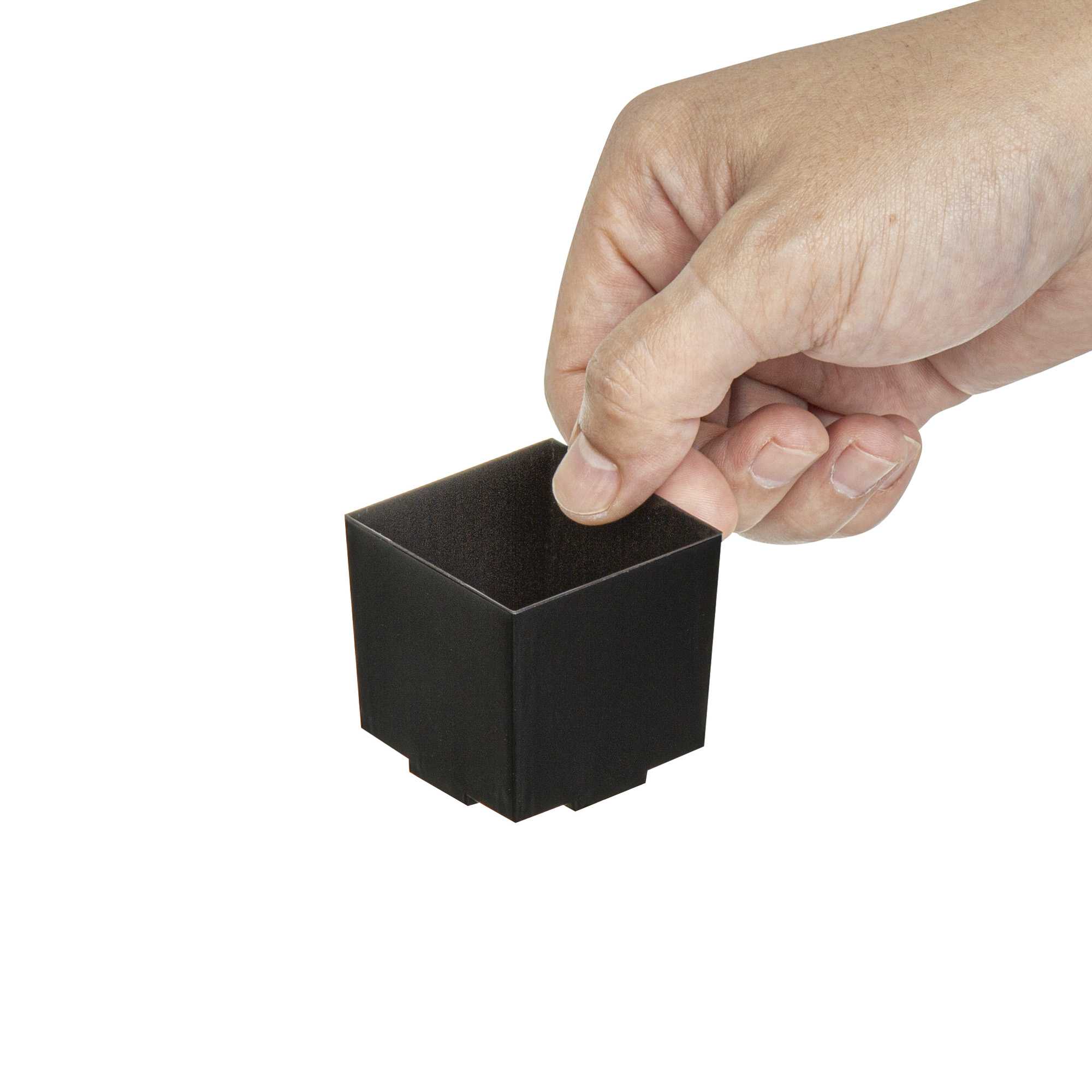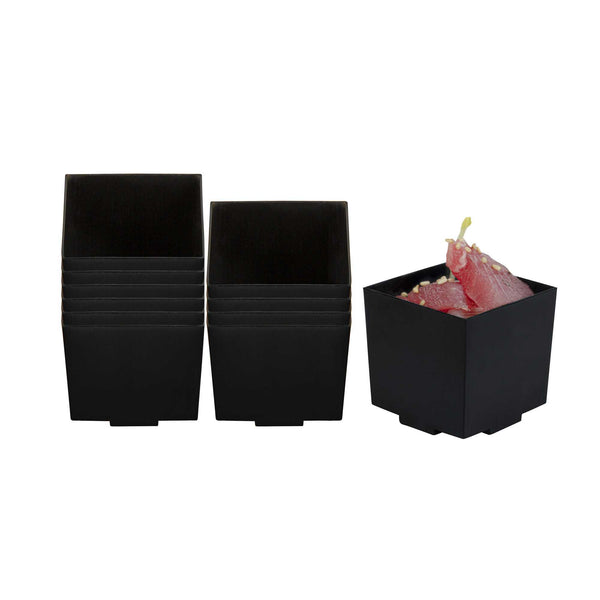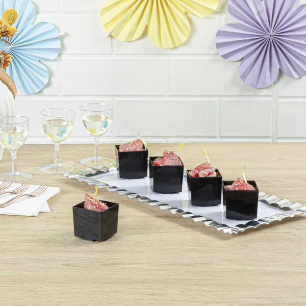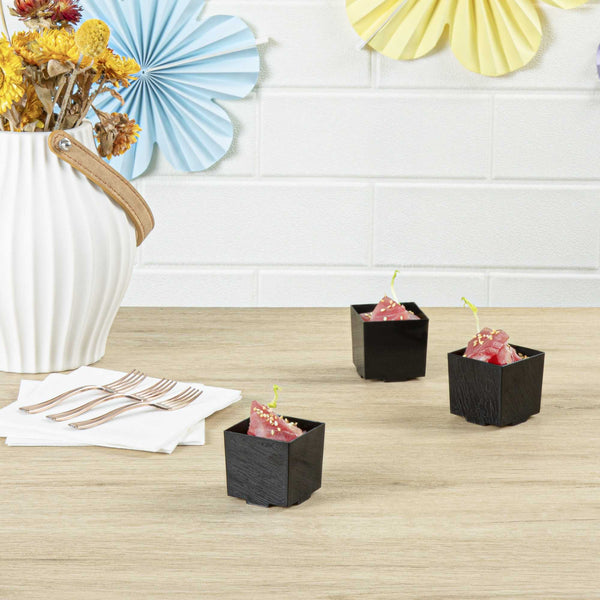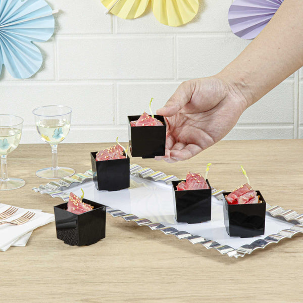 Add a stylish touch to your serving with our Mini Serve 3-Ounce Square Black Plastic Quadrato Cups. Constructed from plastic, these black quadrato cups are durable, ensuring they won't easily crack while in use. The smooth rim on these plastic cups doesn't give accidental scratching, enhancing the overall eating experience. With their square, stackable design, these recyclable plastic appetizer cups are a space-efficient solution, perfect for large events. The deep black color of these square cups lends an attractive aesthetics, making them a great fit for any occasion. The 3-ounce capacity of these plastic dessert cups is excellent for serving small appetizers, desserts, or beverages. Designed for single-use, these disposable plastic cups streamline the cleanup process, making them ideal for parties or events. Measuring 1.5 inches in length by 1.5 inches in width by 1.75 inches in height, these plastic quadrato cups offer a perfect size for bite-sized servings. Sold in a 100 count box.