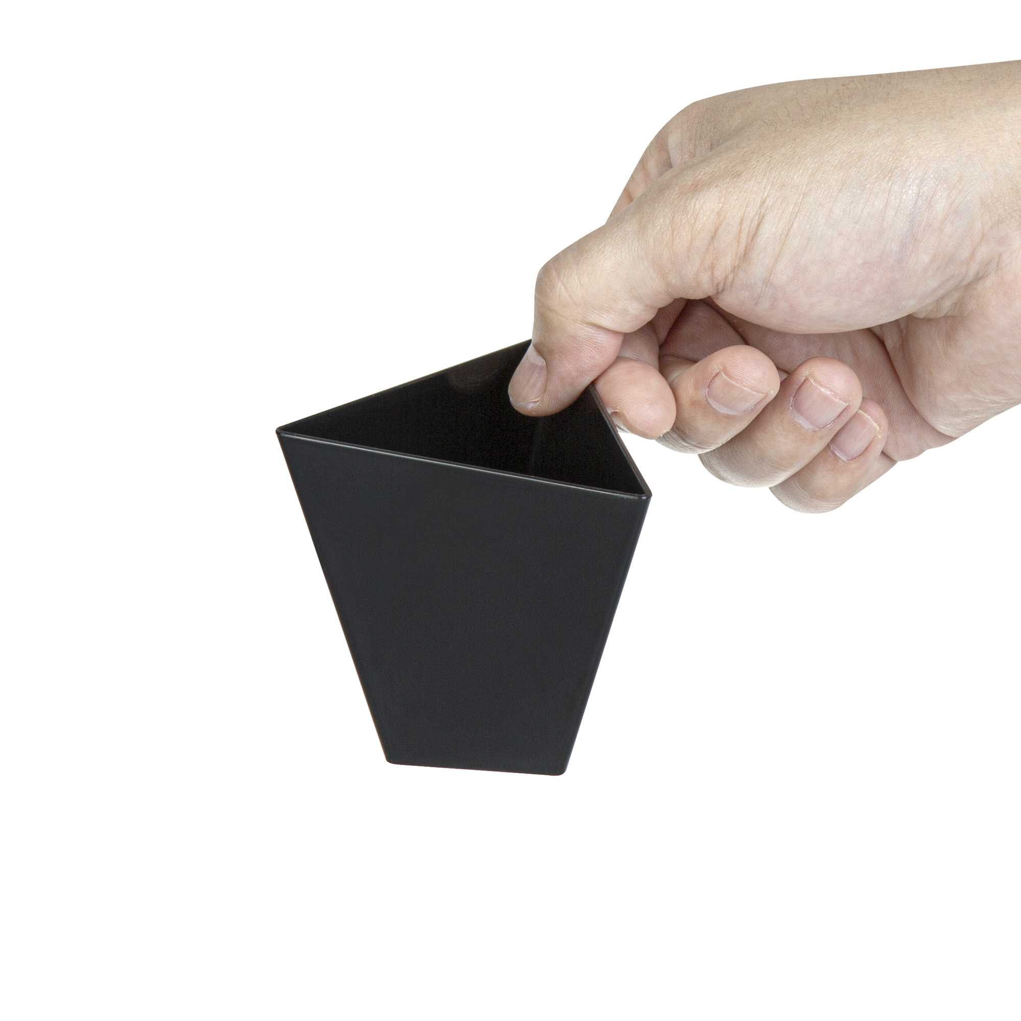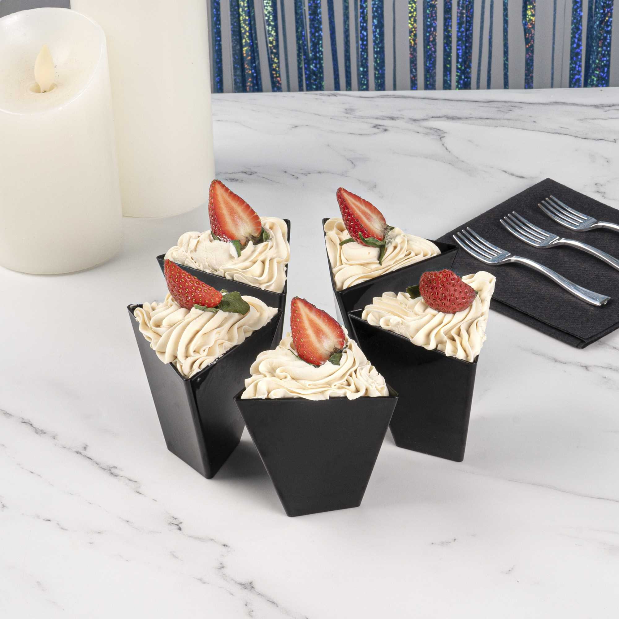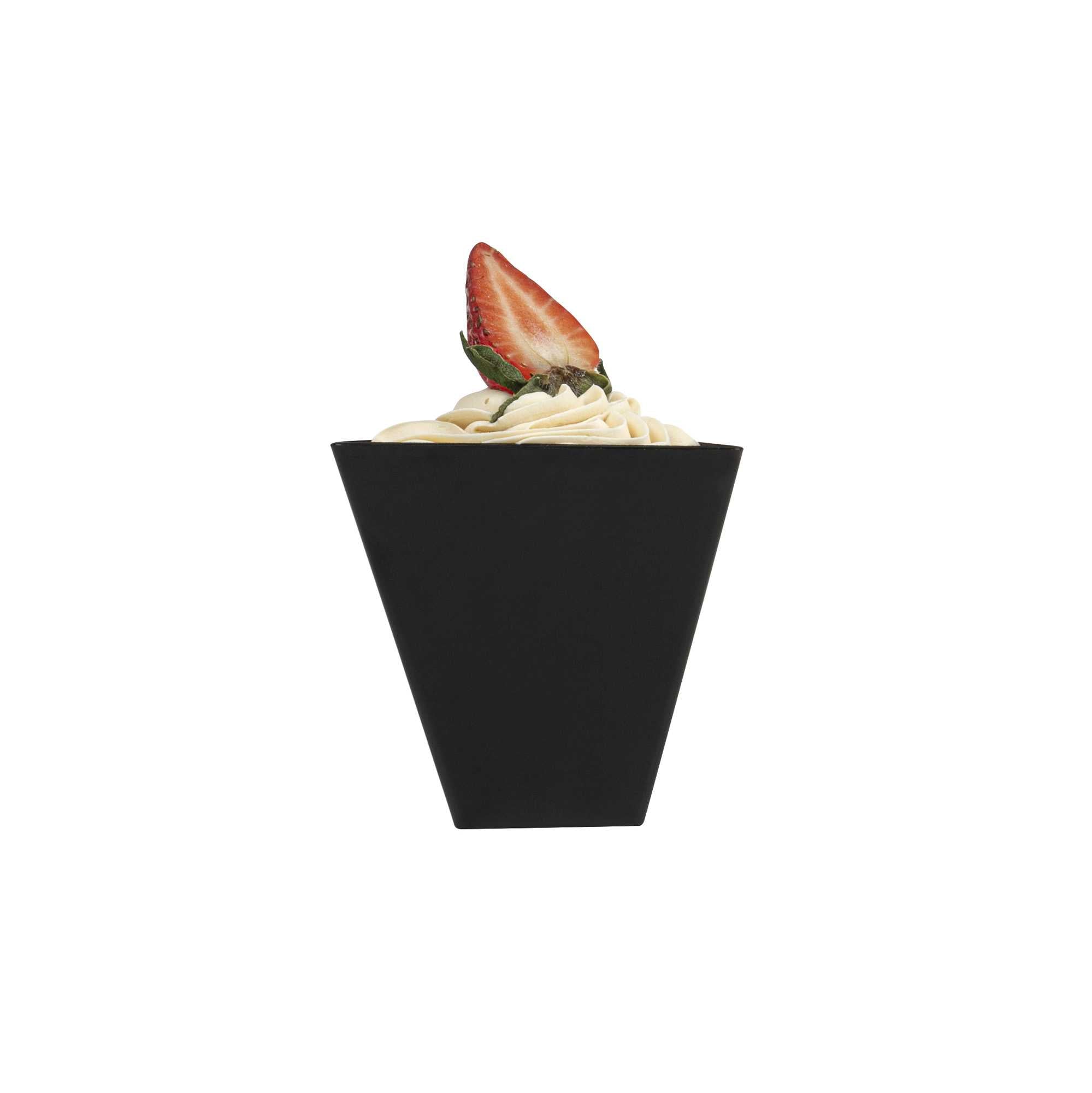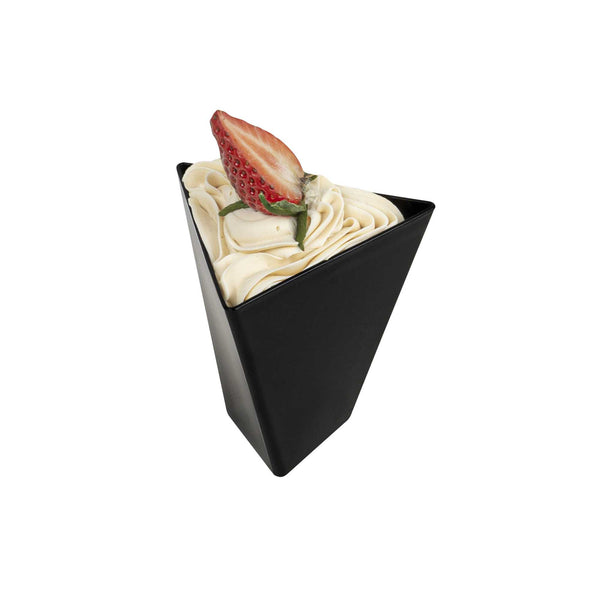 Serve your signature appetizers with our Mini Serve 4-ounce Black Plastic Torcente Dessert Cups. These dessert cups are crafted from high-quality plastic for heavy-duty durability and are ideal for serving a wide range of wet, dry, and cold food items. Holding up to 4 ounces, these appetizer cups are perfect for serving single portions of desserts and appetizers. These plastic cups feature a unique triangular shape that brings a contemporary look to any bite-sized treat. The black finish of these plastic dessert cups adds a touch of elegance and sophistication to your food presentation. For an easy after-service cleanup, these black cups are conveniently disposable. These disposable cups measure 3 inches in length by 2.5 inches in width by 2.75 inches in height and can hold up to 4 ounces. Sold in a 100 count box.