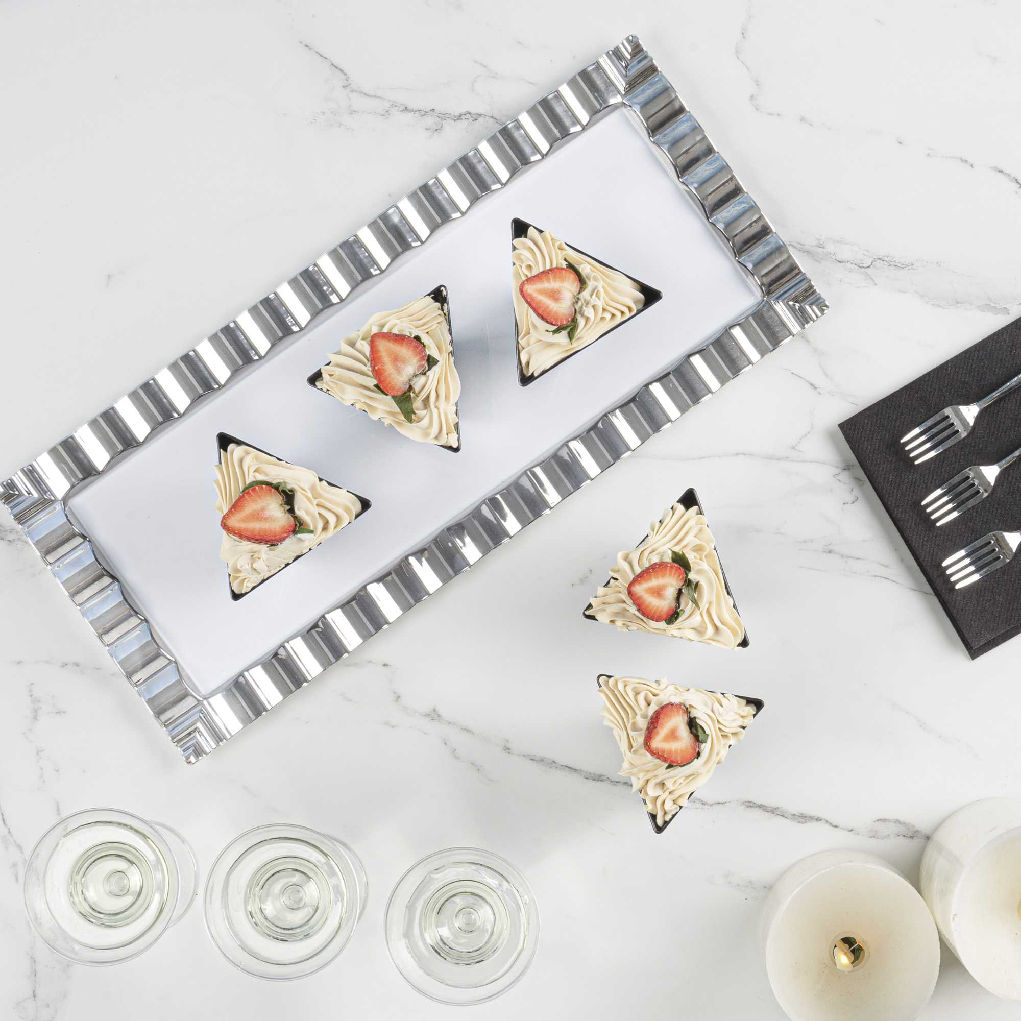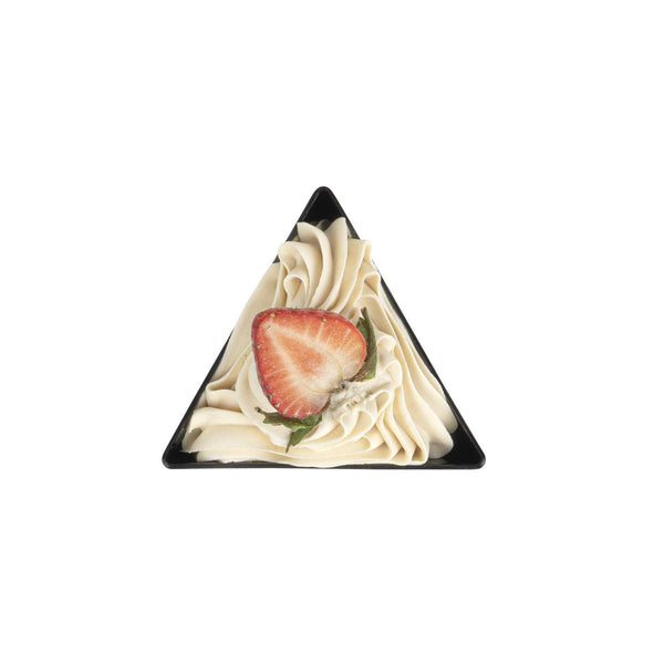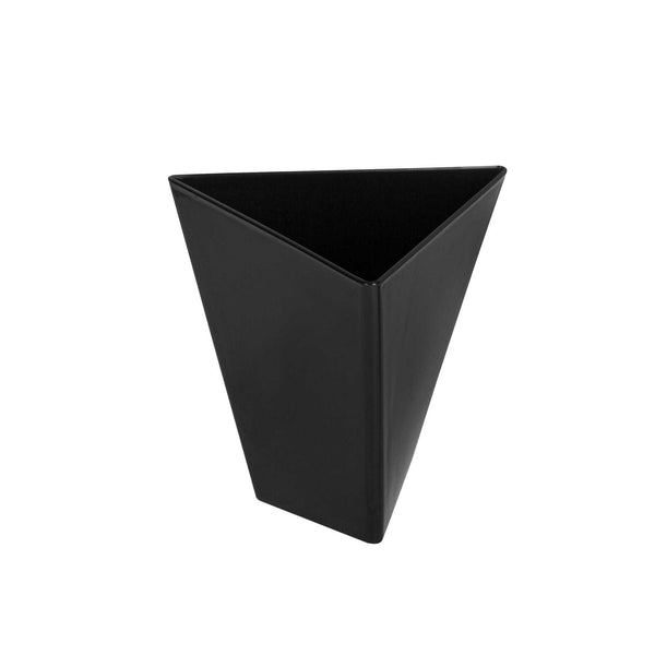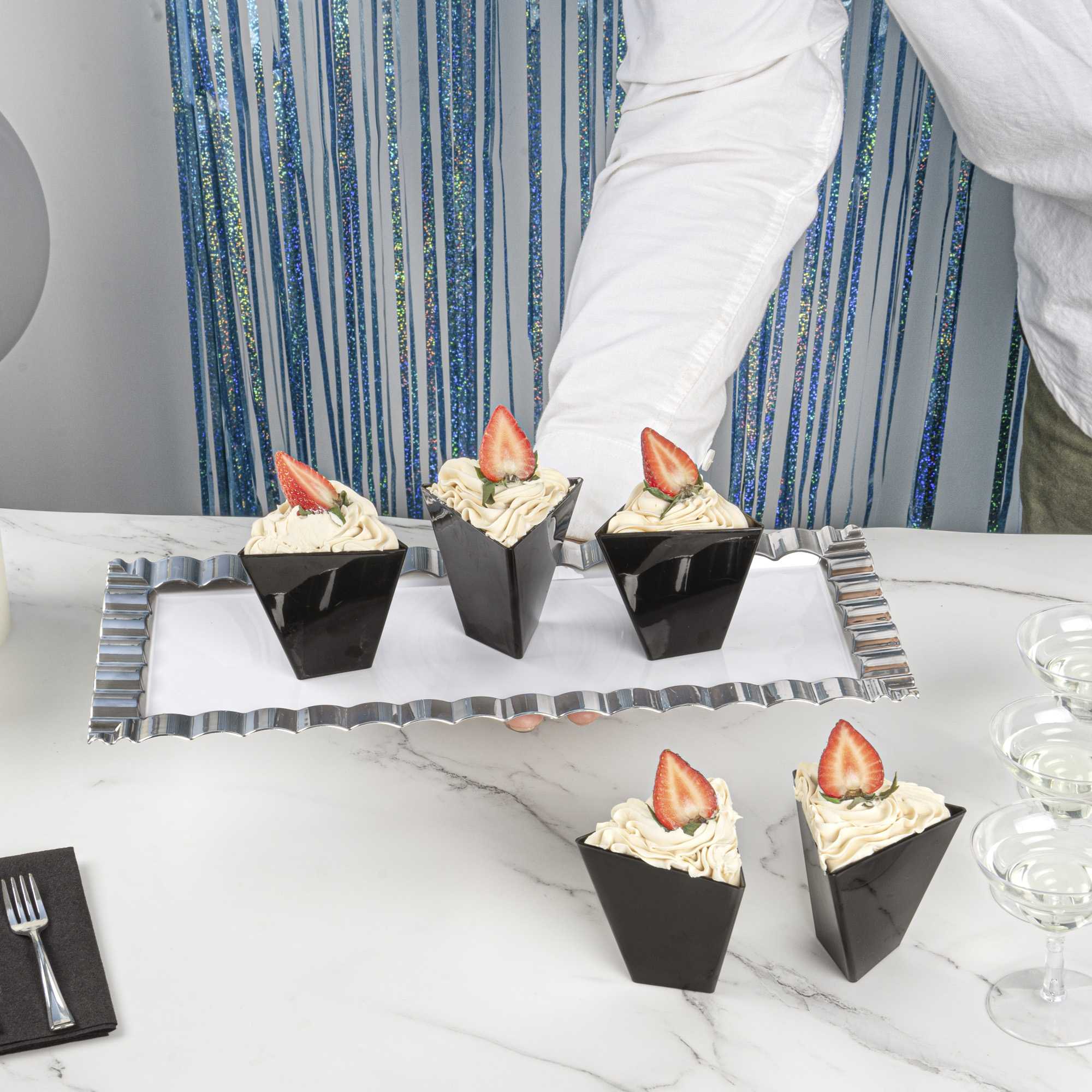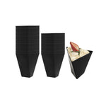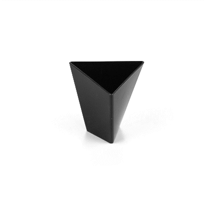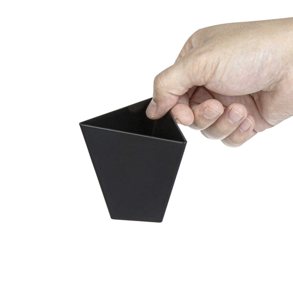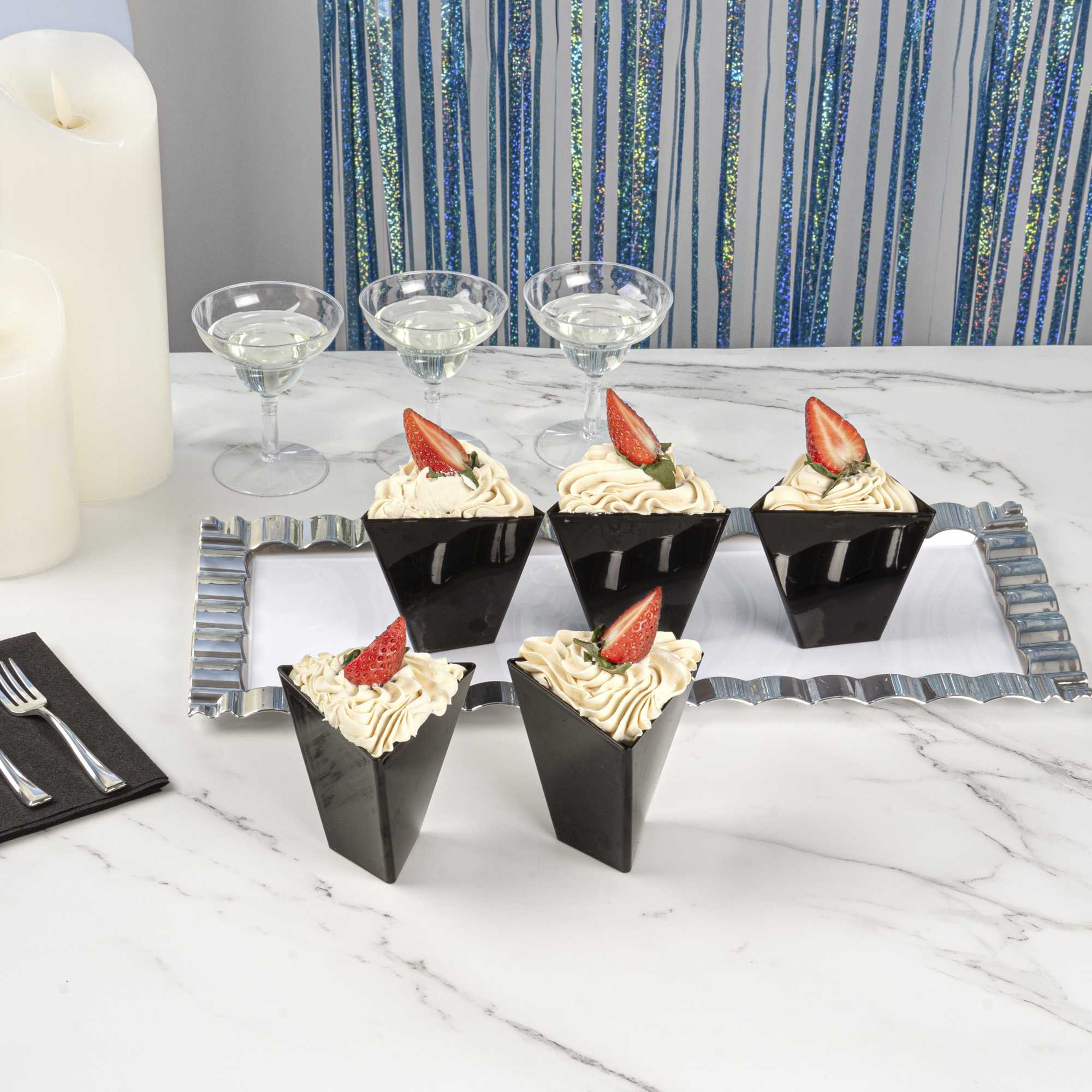 Serve your signature appetizers with our Mini Serve 4-ounce Black Plastic Torcente Dessert Cups. These dessert cups are crafted from high-quality plastic for heavy-duty durability and are ideal for serving a wide range of wet, dry, and cold food items. Holding up to 4 ounces, these appetizer cups are perfect for serving single portions of desserts and appetizers. These plastic cups feature a unique triangular shape that brings a contemporary look to any bite-sized treat. The black finish of these plastic dessert cups adds a touch of elegance and sophistication to your food presentation. For an easy after-service cleanup, these black cups are conveniently disposable. These disposable cups measure 3 inches in length by 2.5 inches in width by 2.75 inches in height and can hold up to 4 ounces. Sold in a 100 count box.