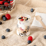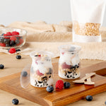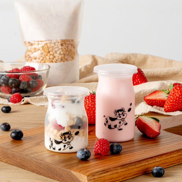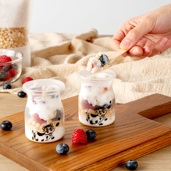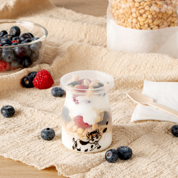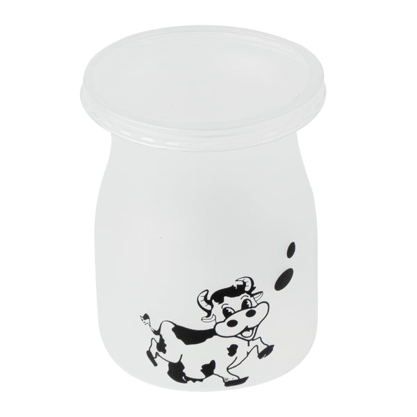 Bring a delightful dessert serving to every order with our Mini Serve 3.5-ounce Clear Plastic Happy Cow Yogurt Cups. Featuring a smiling cartoon cow, these happy cow cups are a chic and delightful way to enjoy yogurt, pudding, or healthy smoothie shots. These plastic cups are ideal for mini snack servings, such as shot glass desserts, jello, yogurt, and other soft sweet treats. Each jello cup comes with a pop-off lid and is made of food-grade PP plastic, making them perfect for securely carrying desserts on the go. These snack-sized cups measure 2.15 inches by 2.75 inches and hold up to 3.5 ounces. Each cup with lid is shipped in bulk in a 100 count box.