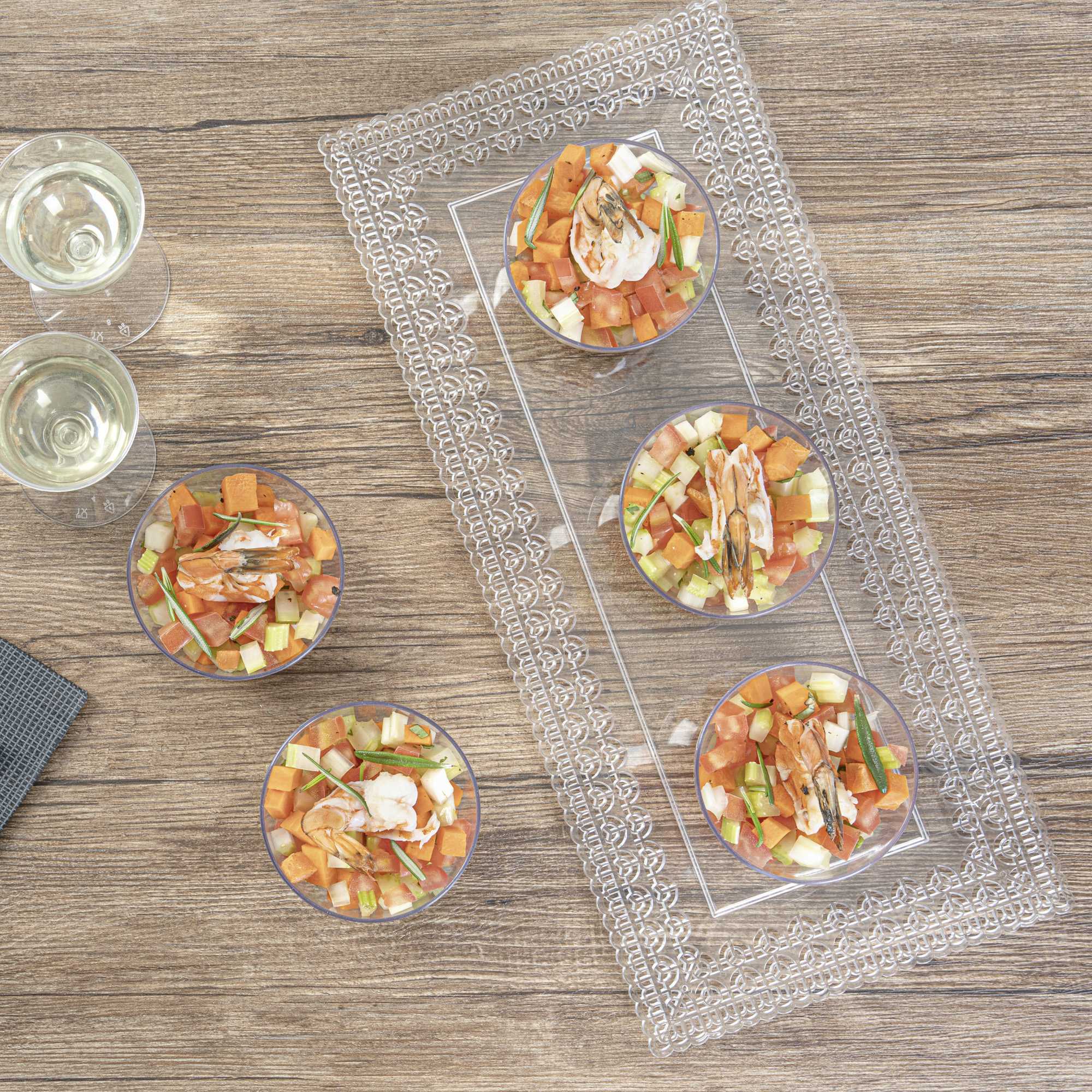 - Clear finish beautifully displays appetizers and desserts
