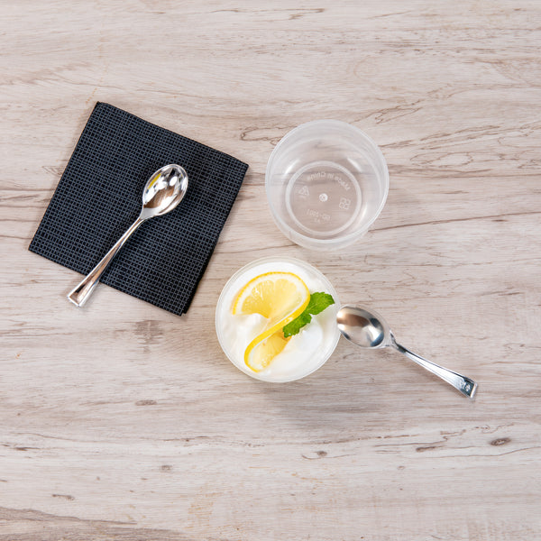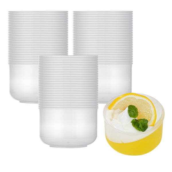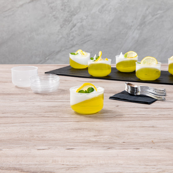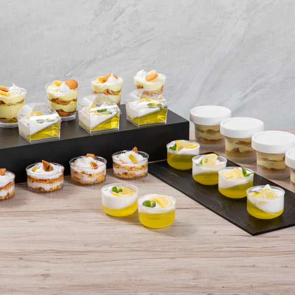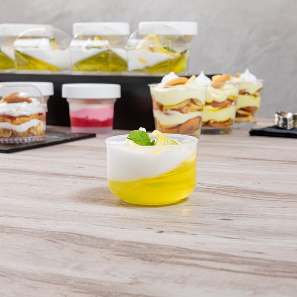 Present your delightful desserts elegantly with our Mini Serve 4-ounce Round Clear Plastic Dessert Cups. Made from BPA-free PP plastic, these recyclable plastic dessert cups are designed to withstand hot and cold food items, offering versatility for your varied menu. For added convenience, these clear dessert cups are microwavable, ensuring a quick and efficient way to heat your delectable treats. The clear finish of these plastic dessert containers entices customers with a glimpse of your culinary creations. To boost storage efficiency, these clear plastic dessert cups are stackable, saving you valuable space. With a capacity of 4 ounces, these plastic dessert glasses are perfect for portion control. Pair it with our available lids (RWP1432C) for easy carrying for to-go orders. Measuring 2.75 inches in length by 2.5 inches in width by 1.75 inches in height, these recyclable plastic dessert cups ensure a comfortable grip for your patrons. Sold in a 100 count box.