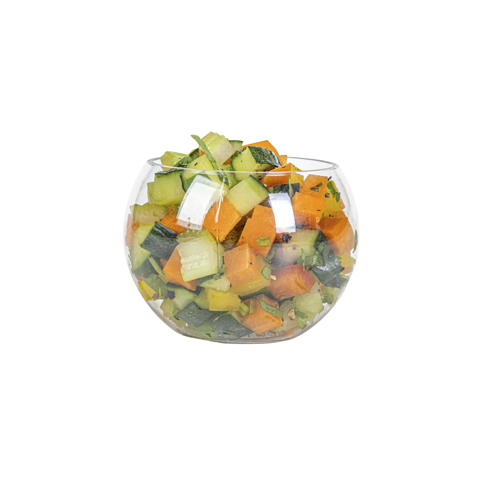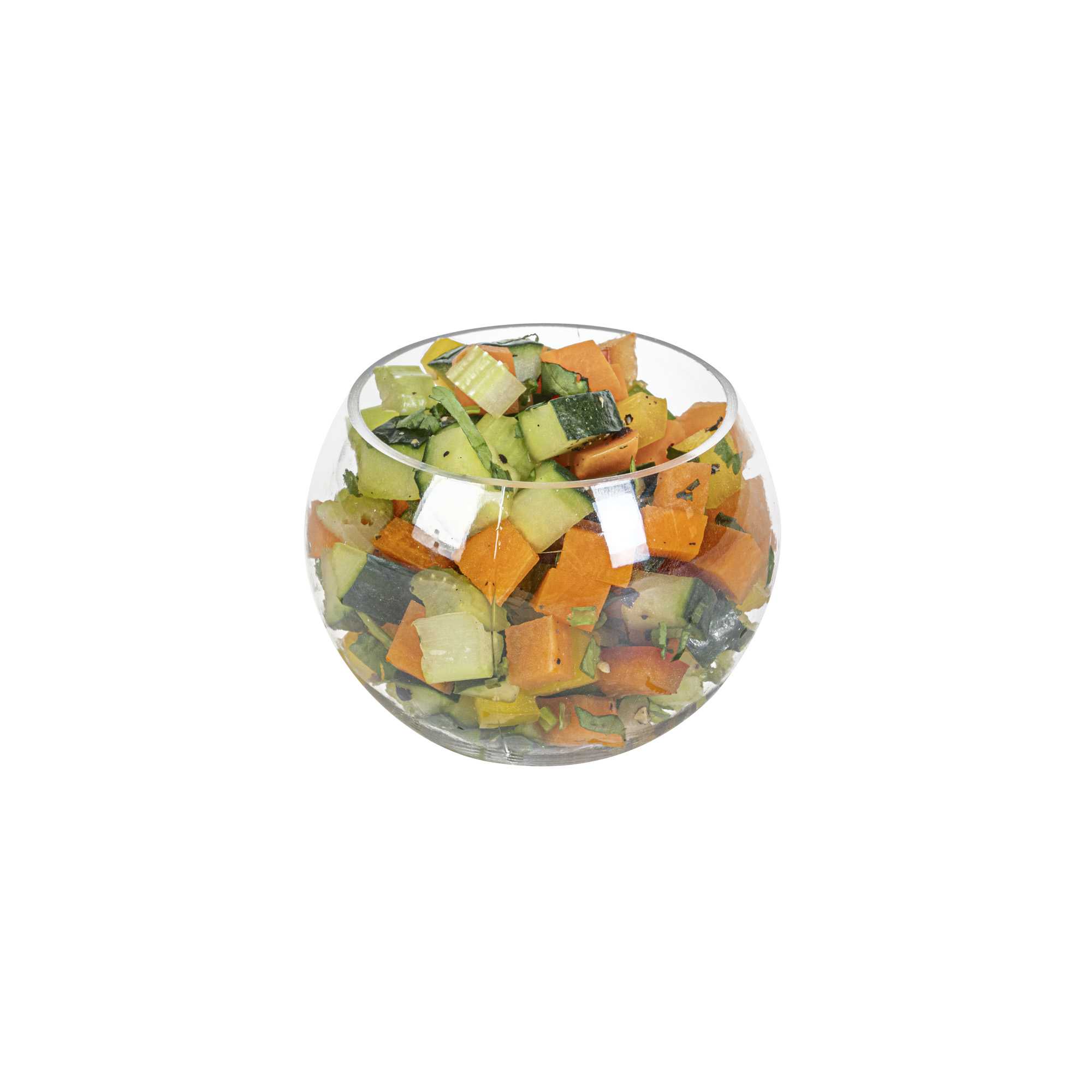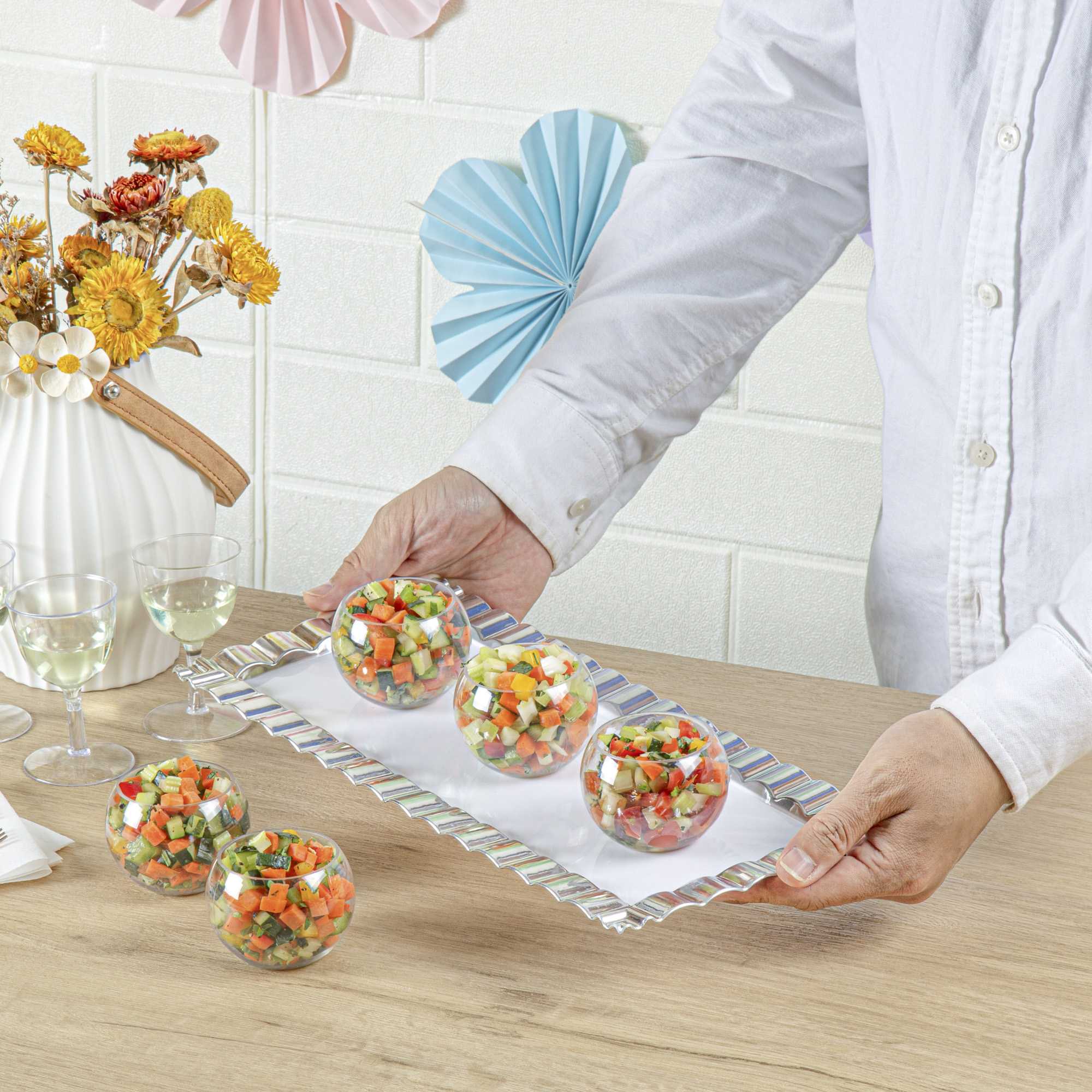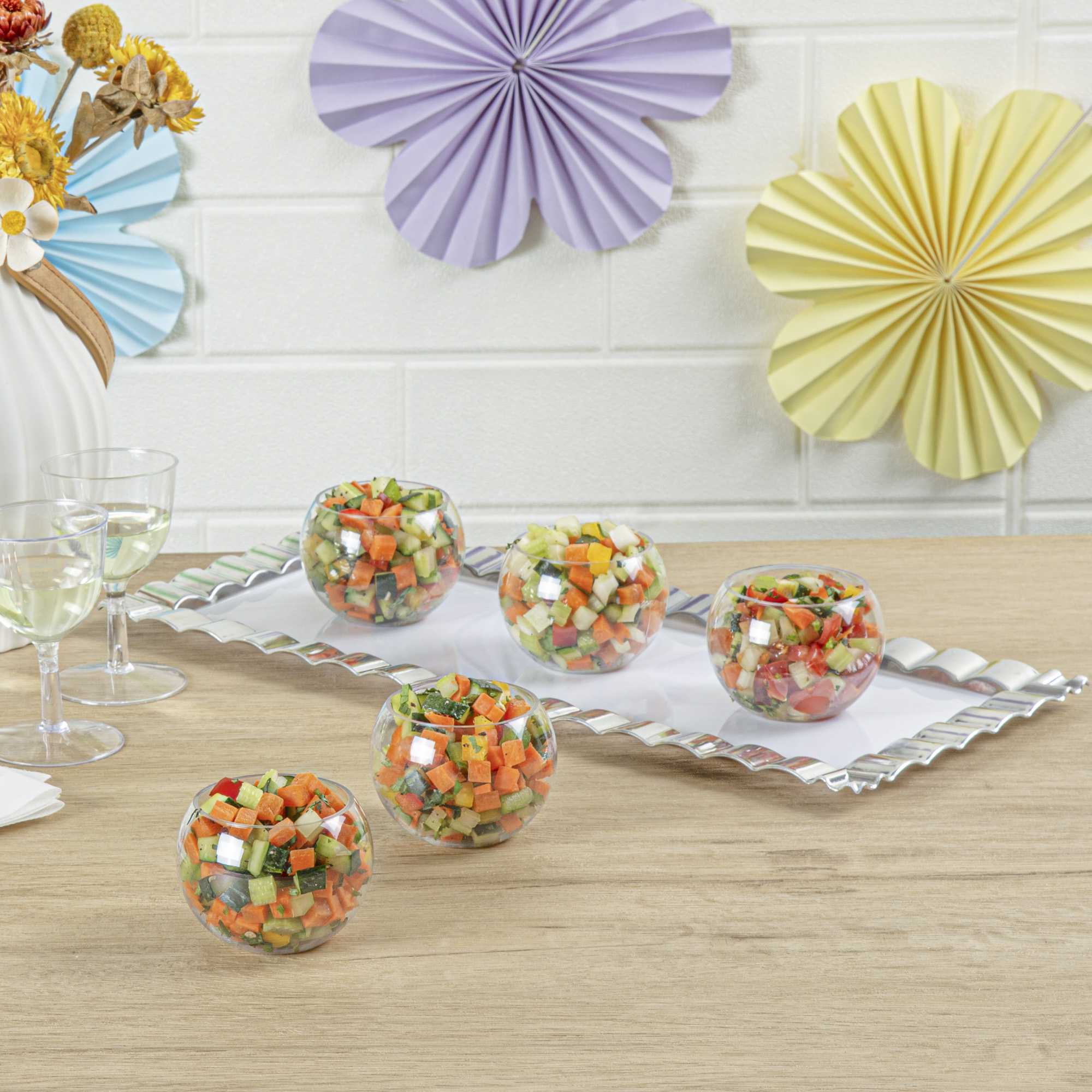 Serve small bites in style with our Mini Serve 4-ounce Sphere Clear Plastic Cups. These versatile plastic portion cups are ideal for presenting desserts, appetizers, and snacks in any setting. Crafted from durable plastic, these disposable dessert cups feature a grease-friendly design that helps maintain the clean presentation of cookies, pastries, and other treats, perfect for catering events and parties. With their freezer-friendly capability, these plastic sphere cups conveniently store prepped dishes and chilled desserts. The crystal clear finish provides enhanced visibility for quick identification. Measuring 2.75 inches in diameter and 2.25 inches in height, these individual serving cups are compact yet roomy for a variety of uses. Sold in a 5 count box.
