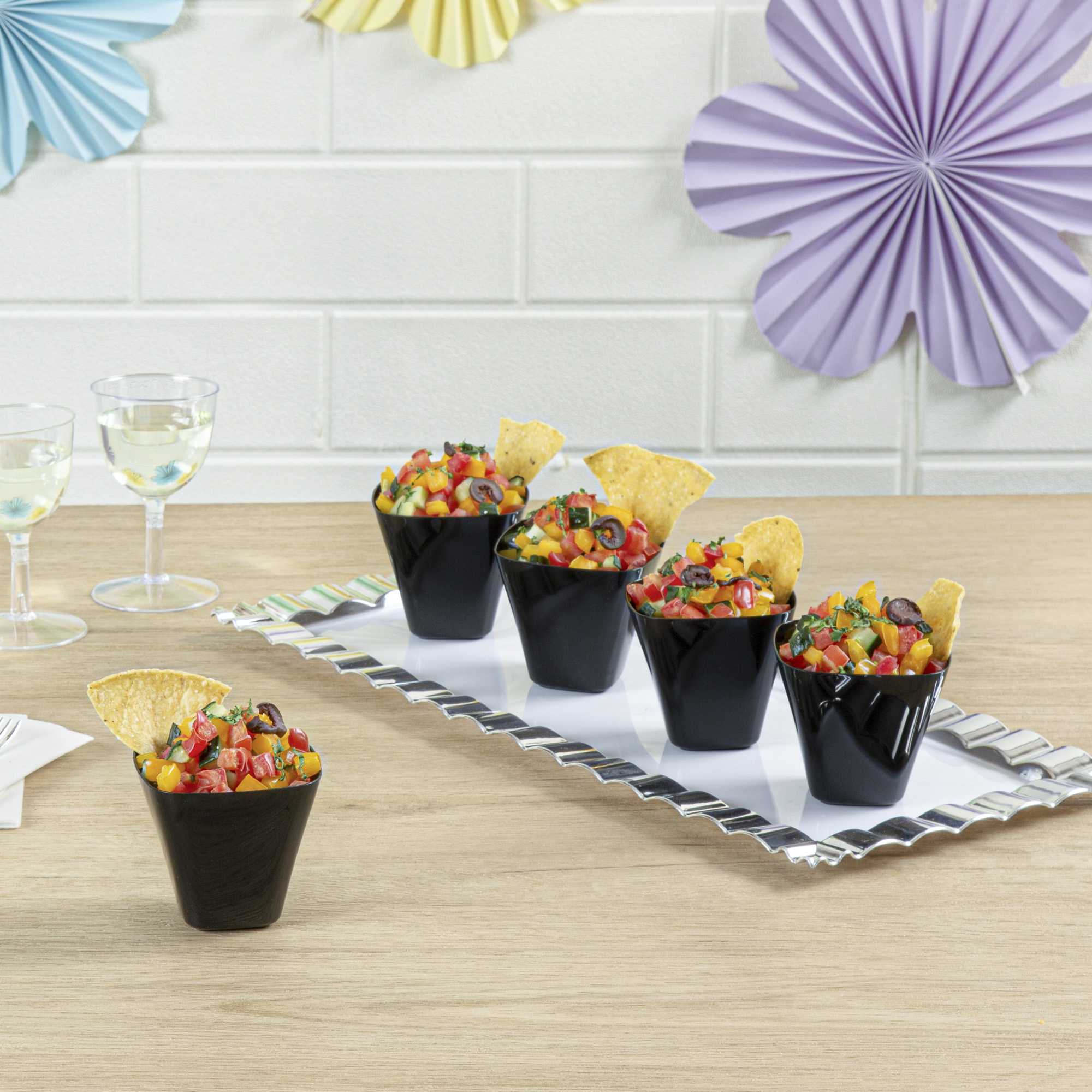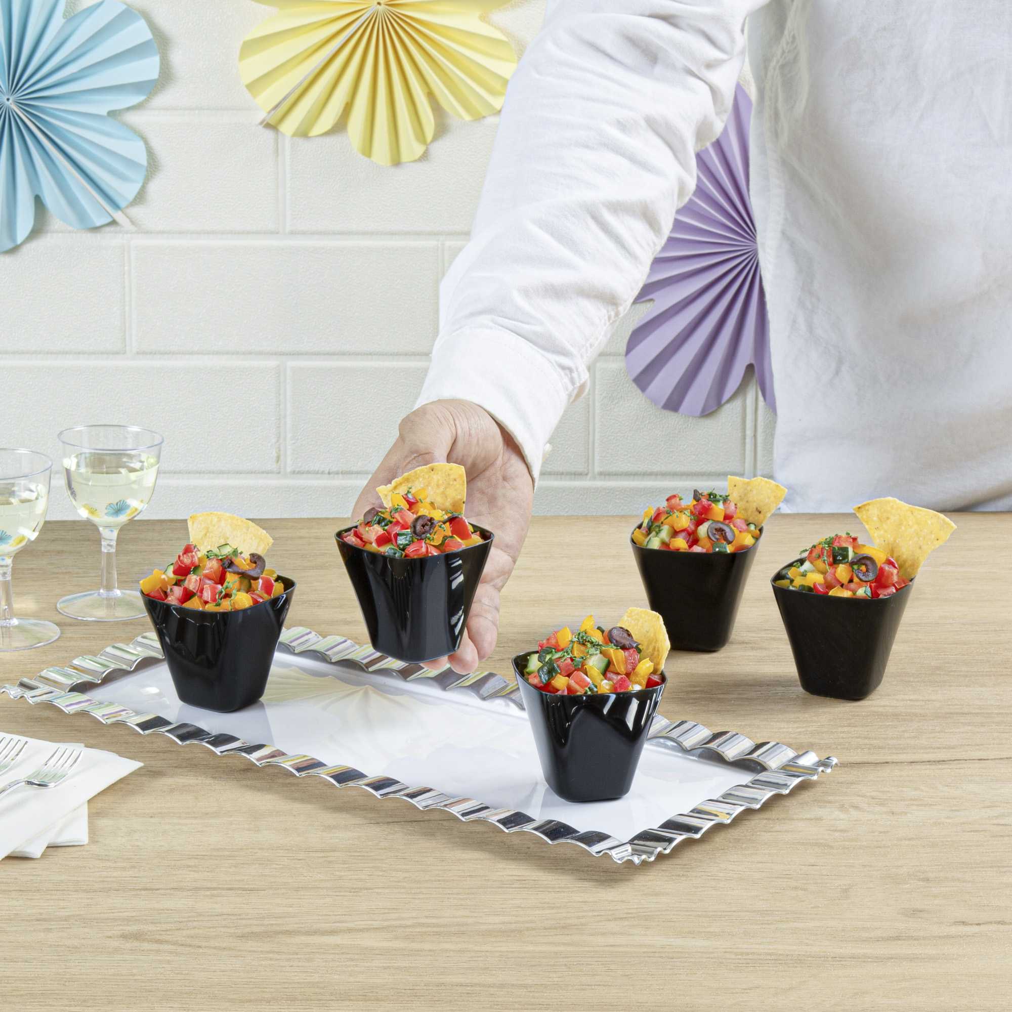 Make your delicious bite-sized appetizers and miniature desserts temptingly portable with these Black Belissima Tasting Cups. With a capacity of 3.5 ounces, these mini plastic dessert cups are perfect for serving tasting portions of your best-selling entrees at a cocktail party or for presenting individually portioned pastries at a catered event. Stylishly serve up your creatively plated hors d'oeuvres and mini appetizers in these conveniently disposable cups to ensure quick, easy, and hassle-free post-event cleanup. Constructed from strong and sturdy plastic, these small dessert cups feature a sleek black finish to bring a sophisticated twist to your next buffet, wedding, or other catered function. Browse our Mini Serve selection of disposable miniature flatware to complete the look! These black tasting cups measure 2.5 inches in length, 2.5 inches in width, and sold in a bulk 100-count box.