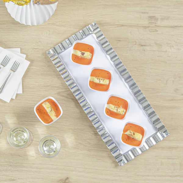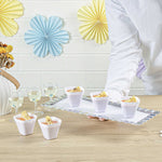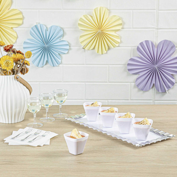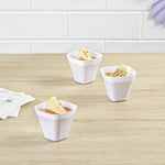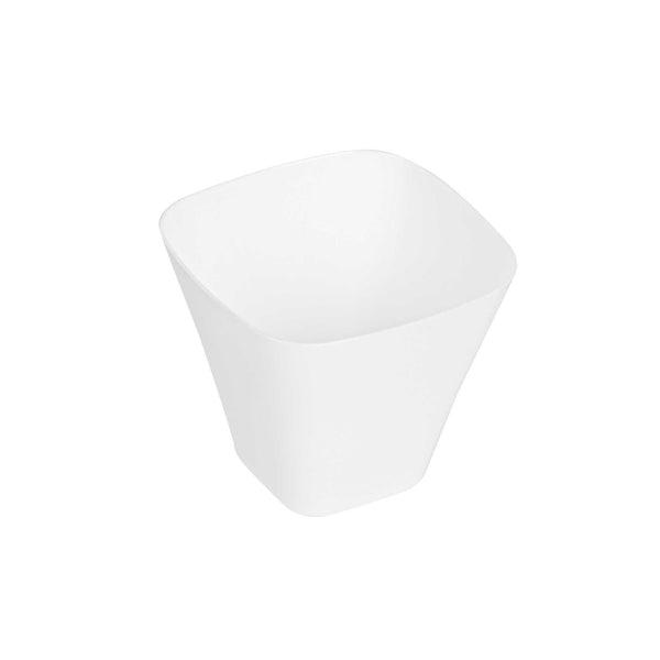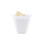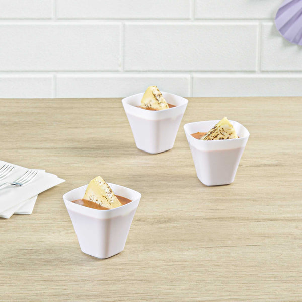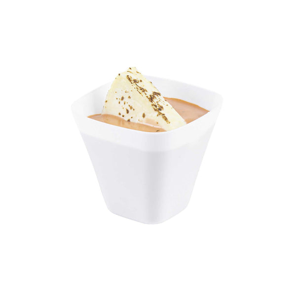 Showcase miniature desserts and hors d'oeuvres inside these sleek and stylish White Bellissima Tasting Cups. Designed with a narrow square base and widened opening, these mini dessert glasses provide an easy and mess-free way for guests to enjoy your delicious treats. Use these square dessert cups to serve miniature portions of a spicy seafood ceviche, or to present bite-sized samples of a creamy key lime cheesecake. Featuring a universally flattering white finish, these sophisticated appetizer cups are ideal for bridal showers, weddings, cocktail parties, buffets, and all types of catered functions. Not to mention, these disposable mini dessert cups are made of recyclable plastic to ensure quick and hassle-free cleanup. Each of these modern tasting cups measures 2.2 inches tall and has a capacity of 3.5 ounces. Browse our Mini Serve selection of miniature disposable flatware to complete the look! Sold in a 100-count box.