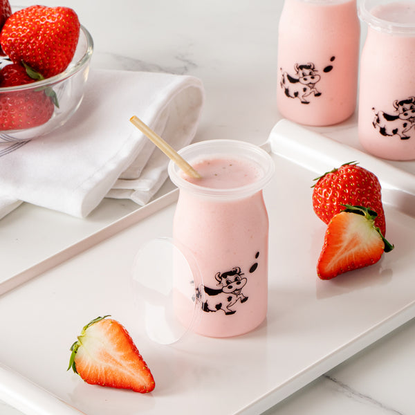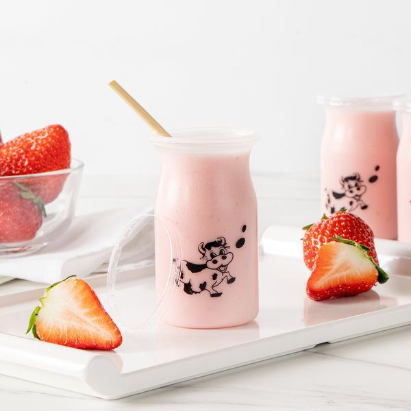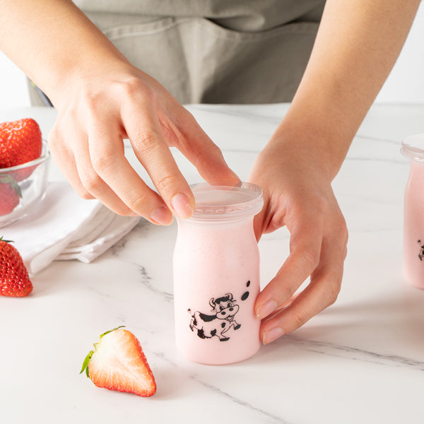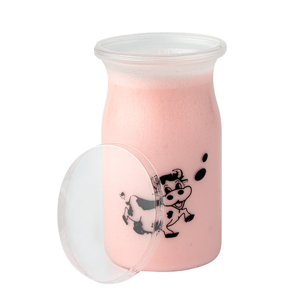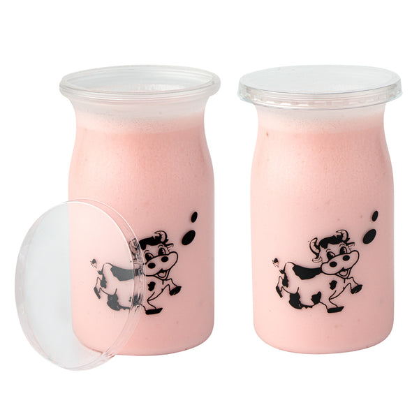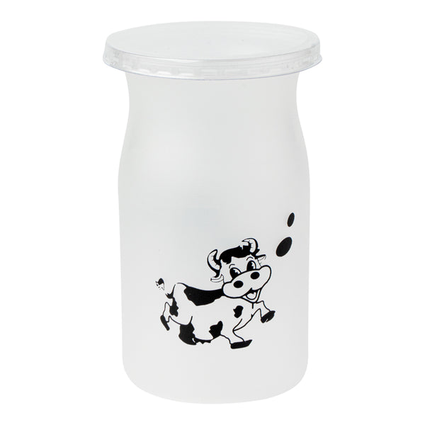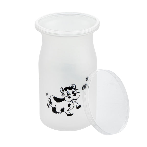 Bring some playful charm and frivolous fun to desserts with our Mini Serve 5-ounce Clear Plastic Happy Cow Yogurt Cups. Each yogurt cup comes with a pop-off lid to securely carry yogurt on the go. Featuring an adorable smiling cartoon happy cow printed on every cup, these cups are a chic and delightful way to enjoy yogurt, ice cream, or any other soft dessert and sweet treat. Ideal for creams or snacks like vanilla pudding, dirt pudding, or homemade fruit smoothies, these cups are made of food-grade PP plastic and are great for take out and to-go dessert servings. These snack-sized cups measure 2.25 inches in diameter by 3.5 inches in height and hold up to 5 ounces. Shipped in a 100 count box.