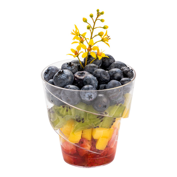 Instantly upgrade your appetizer and dessert presentations with our Mini Serve 5-ounce Round Clear Plastic Mini Flourish Cups. Crafted from premium plastic, these small dessert cups are great for presenting individual servings of tasty offerings at your restaurant, buffet, or catering event. Featuring an incline spiral design, these recyclable plastic dessert cups effortlessly enhance food presentations and complement the decor at any venue. With a crystal clear finish, these cups let your guests view every delectable layer of sweet berry cheesecake parfaits at your catered luncheon or savory shrimp ceviche at your upscale restaurant. Containing up to 5 ounces, these individual dessert cups measure 2.75 inches in diameter by 2.75 inches in height. Shipped in a 100 count box.