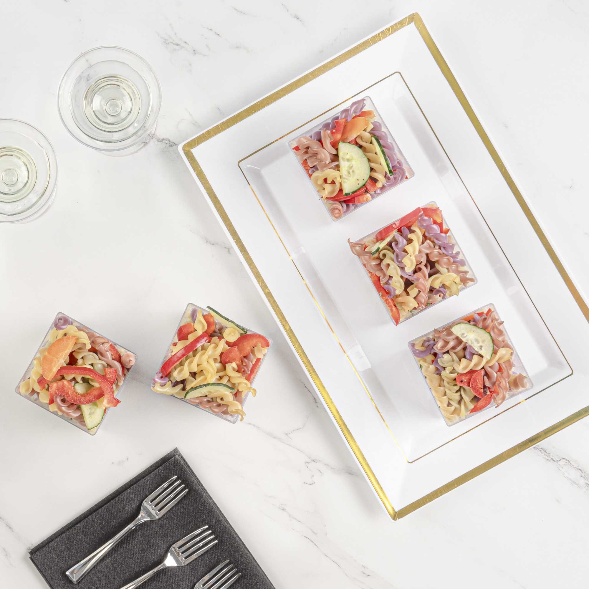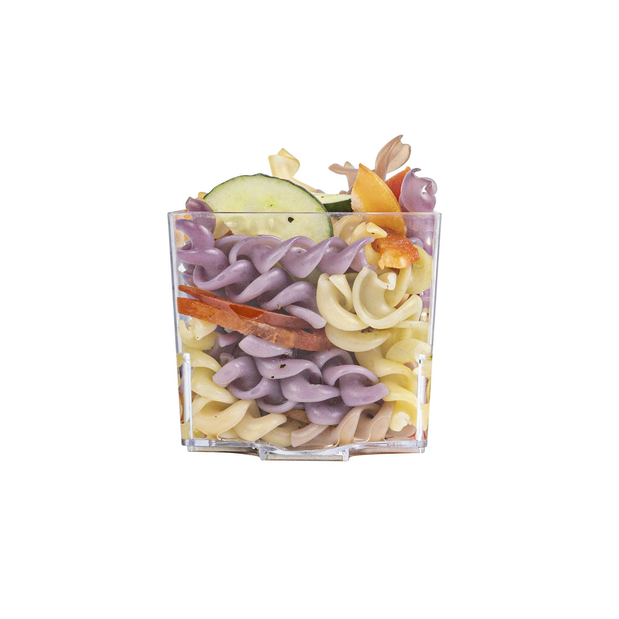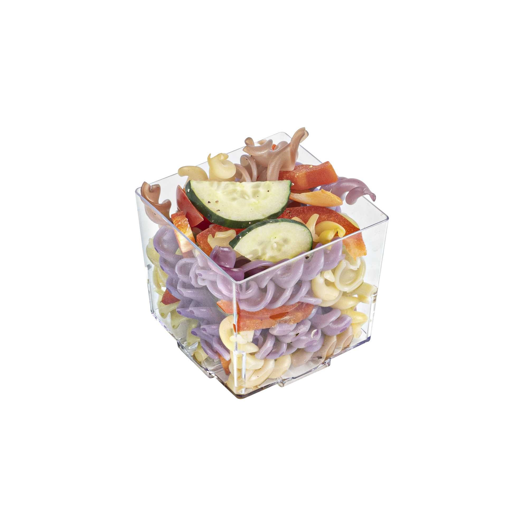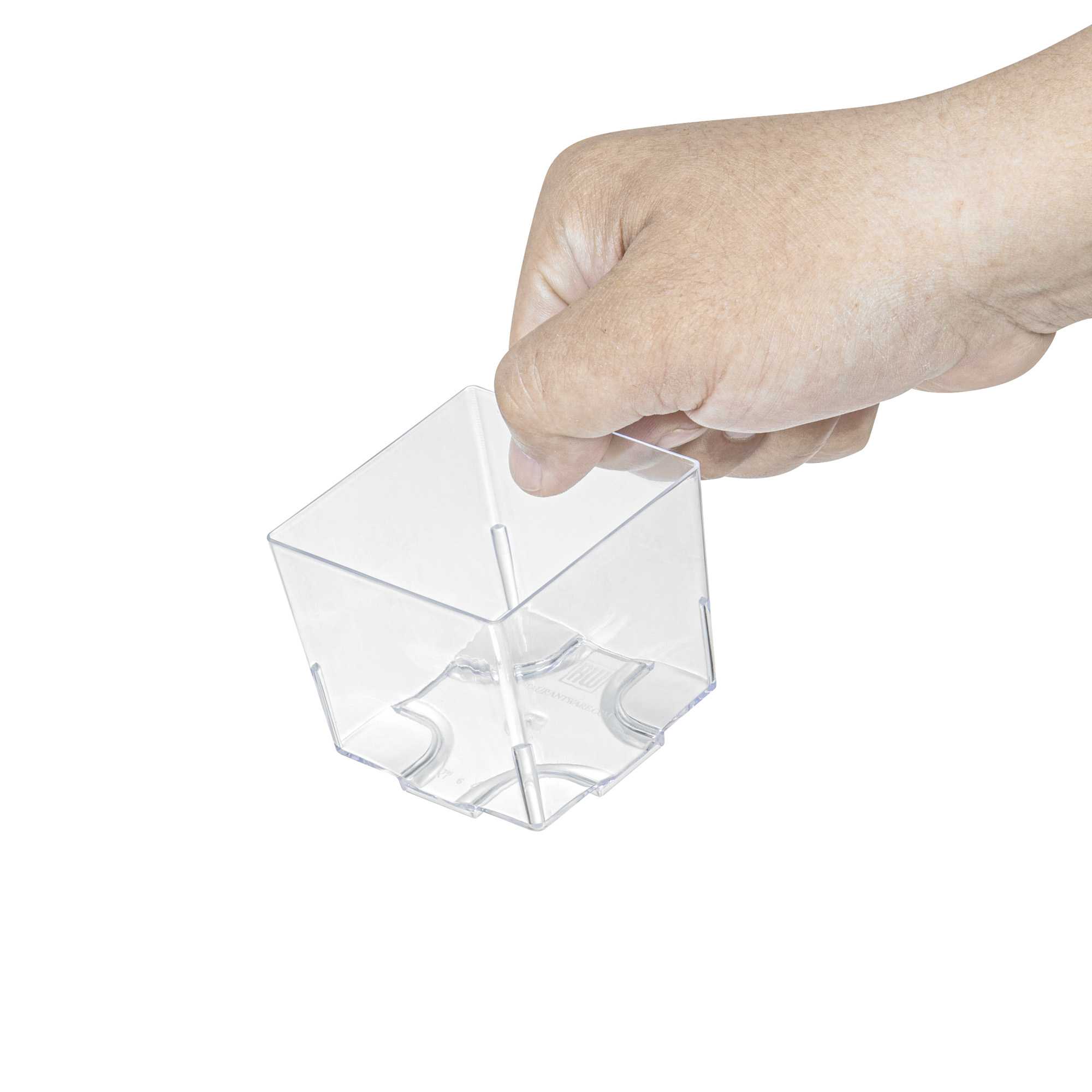 Bring a modern and upscale twist to serving hors d'oeuvres and individually-sized desserts with our Mini Serve 5-ounce Square Clear Plastic Large Quadrato Cubes. These cubic plastic dessert bowls have a transparent design to lend a touch of elegance to any event's presentation. Constructed from premium recyclable plastic, these dessert cups serve as an eco-friendly alternative. These disposable dessert cups provide stable and secure containment for liquids and solid foods. The distinct square shape of these 3-ounce dessert bowls is unique and attention-grabbing. These cubic plastic dessert bowls are disposable, making post-event cleanup effortless. Lightweight yet durable, these clear dessert cups ensure easy handling and portability. With a 5-ounce capacity, these recyclable dessert cups are ideal for tasting portions or small appetizers. Measuring 2.25 inches in length by 2.25 inches in width by 2.25 inches in height, these plastic dessert bowls save on space. Sold in a 20 count box.