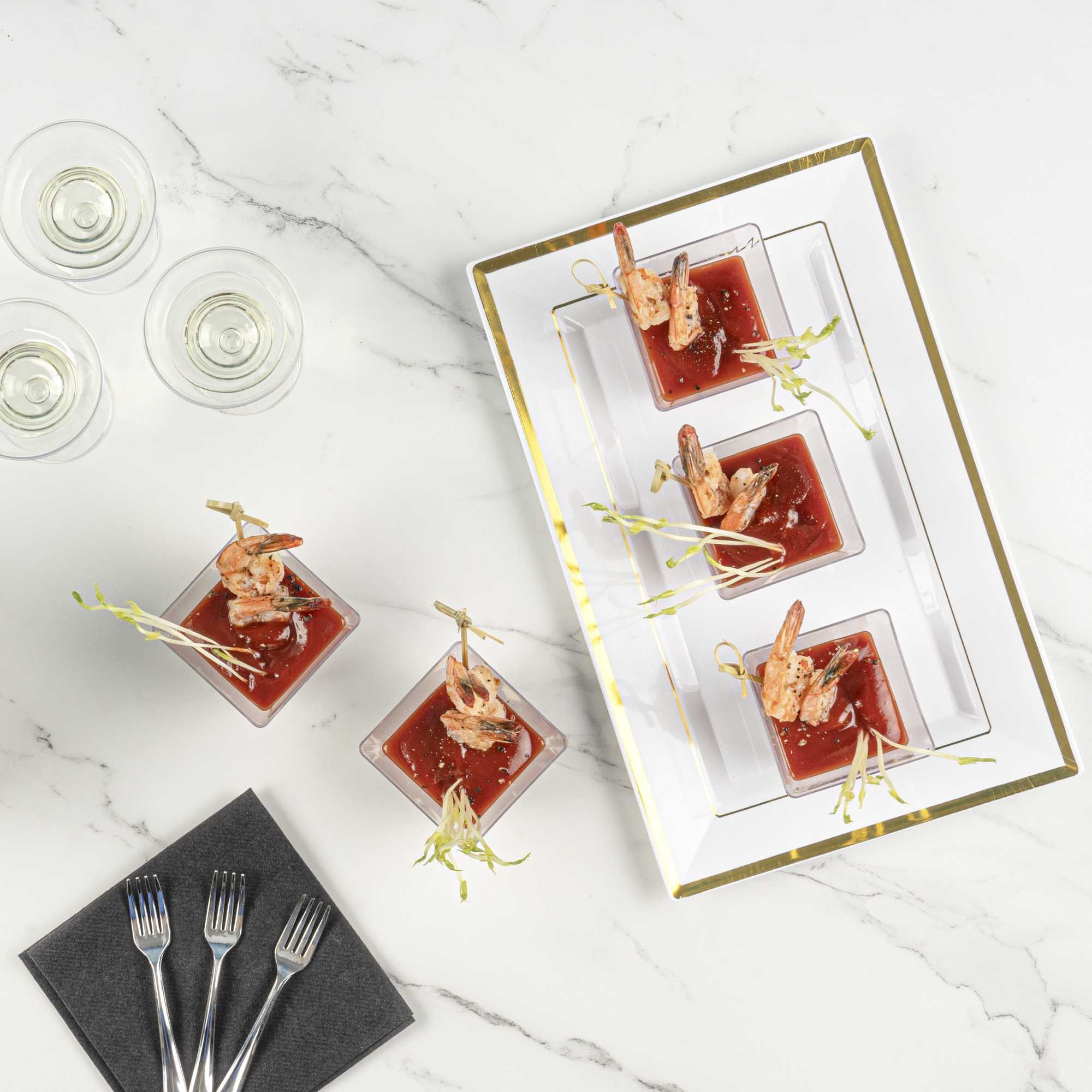 With a sturdy plastic construction, these tiny serving cups are crack-resistant to prevent condiments or drinks from leaking through. The lightweight design of these mini food cups allows you to serve a number of samplers with ease.