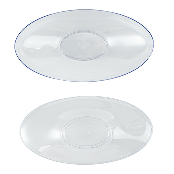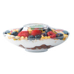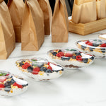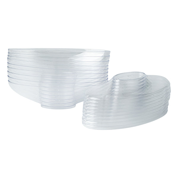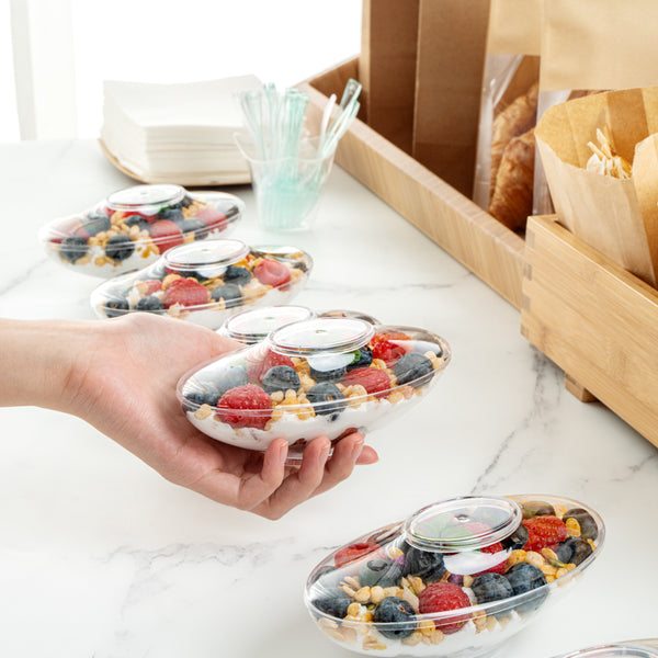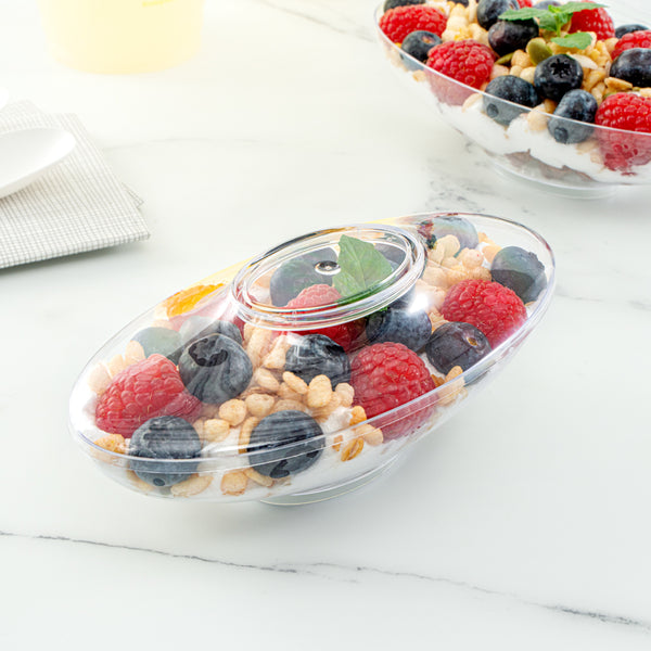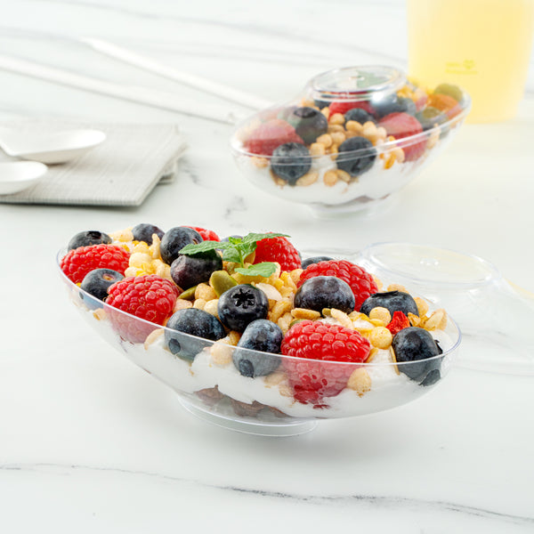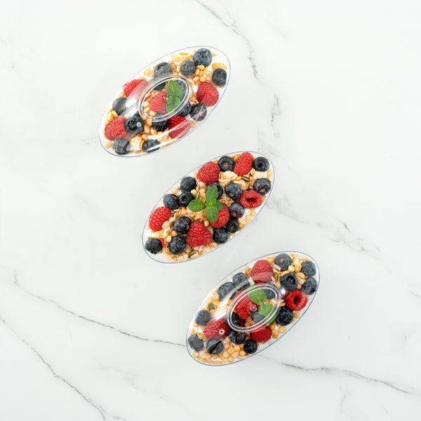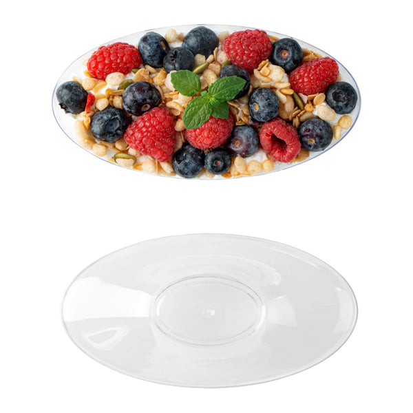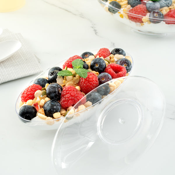 Show off vibrant smoothie bowls and salads using our Mini Serve 6-ounce Oval Clear Plastic Deli Cups. Built with high-quality plastic, these plastic deli cups have a clear finish that expertly displays dishes. These oval containers are designed to be durable and crack-resistant so customers can safely enjoy meals on the go. To prevent spills, these clear deli containers include tight-fitting lids that securely snap onto cups. With a stackable design, these plastic deli cups are ideal for saving space in your kitchen. For eco-friendly disposal after use, these oval containers are conveniently recyclable. These clear deli containers can hold up to 6 ounces and measure 5.5 inches in length by 3.25 inches in width and 2.5 inches in height. Shipped in a 100 count box.